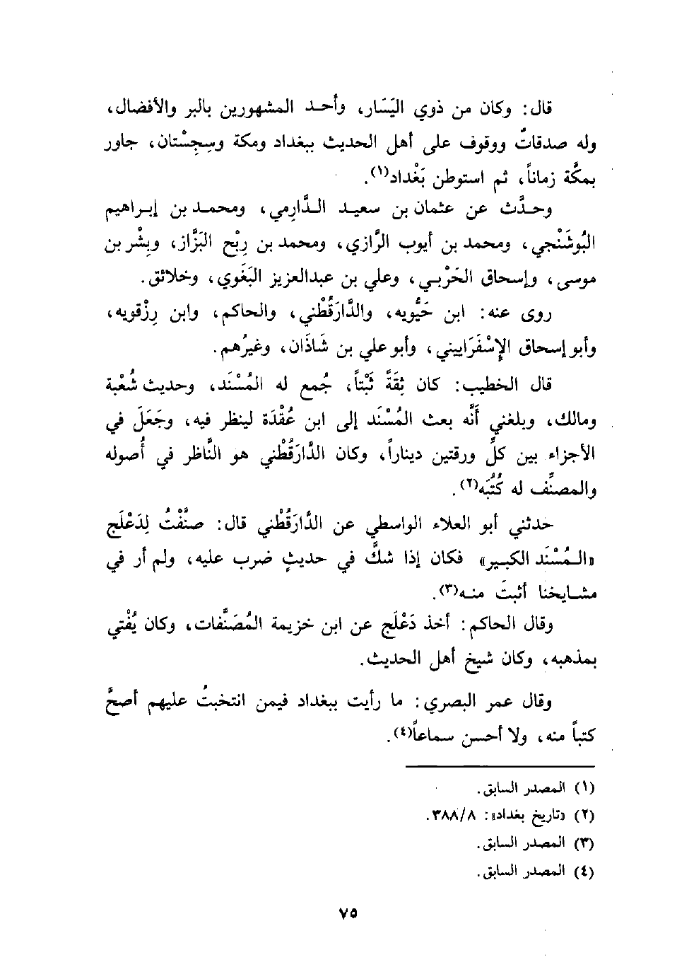 قال: وكان من ذوي اليَسَار، وأحد المشهورين بالبر والأفضال، وله صدقاتٌ ووقوف على أهل الحديث ببغداد ومكة وسِجِسْتان، جاور بمكَّة زمانًا، ثم استوطن بَغْداد (¬1).