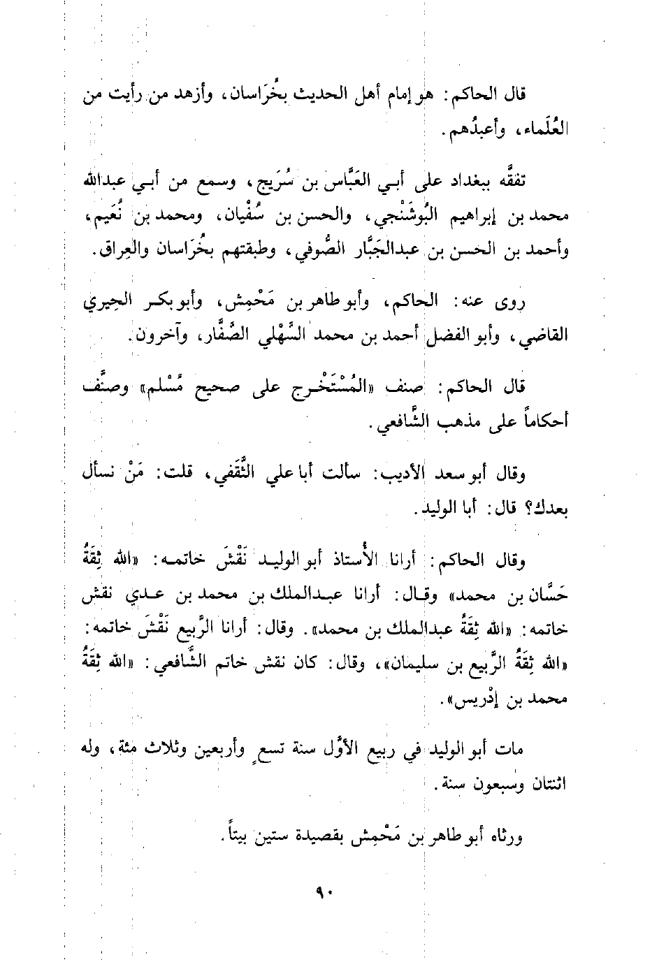 وقال الحاكم: أرانا الأستاذ أبو الوليد نَقْشَ خاتمه: "الله ثِقَةُ حَسّان بن محمد" وقال: أرانا عبد الملك بن محمد بن عدي نقش خاتمه: "الله ثِقَةُ عبد الملك بن محمد". وقال: أرانا الربِيع نَقْشَ خاتمه: "الله ثقَةُ الرَّبيع بن سليمان"، وقال: كان نقش خاتم الشافعي: "الله ثقَةً محمد بن إدْريس".