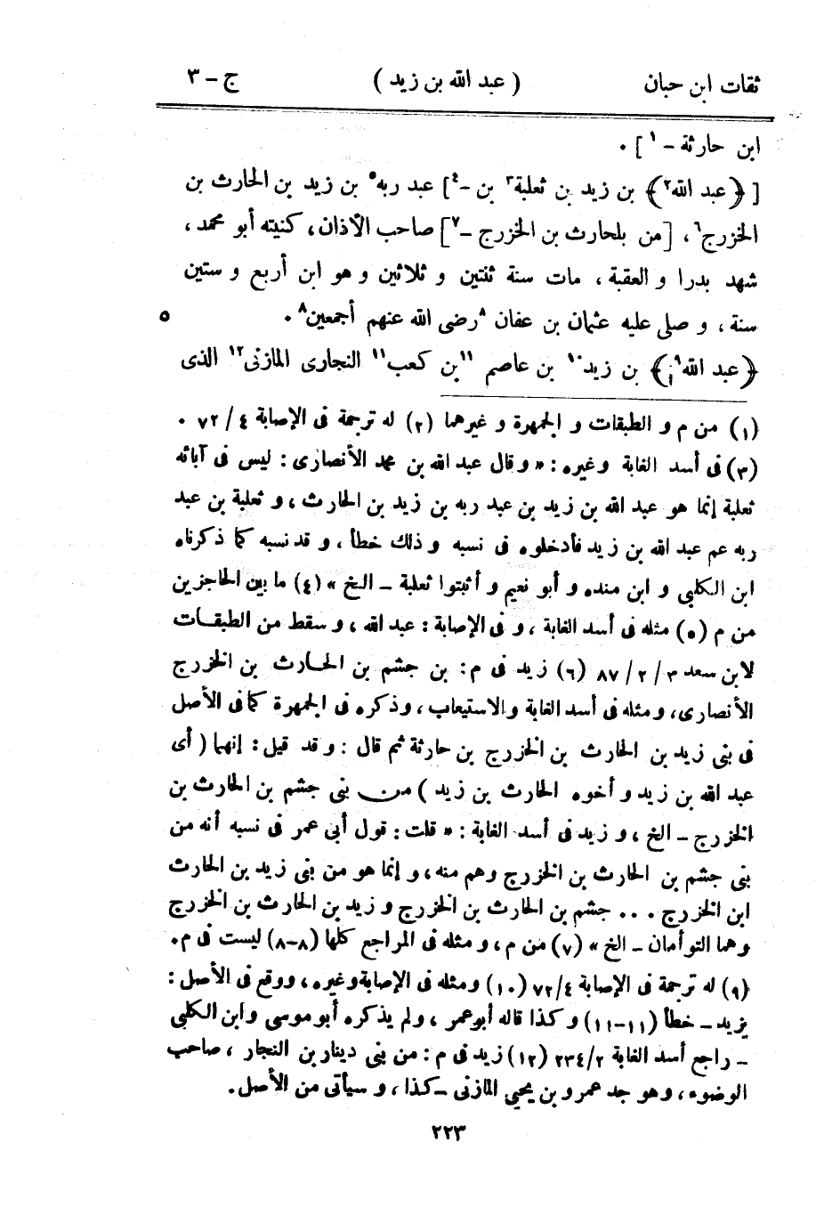 728 - عَبْد اللَّه بْن زيد بْن ثَعْلَبَة بْن عَبْد ربه بْن زيد بْن الْحَارِث بْن الْخَزْرَج من بلحارث بْن الْخَزْرَج صَاحب الْأَذَان كنيته أَبُو مُحَمَّد شهد بَدْرًا والعقبة مَاتَ سنة ثِنْتَيْنِ وَثَلَاثِينَ وَهُوَ بن أَربع وَسِتِّينَ سنة وَصلى عَلَيْهِ عُثْمَان بْن عَفَّان رَضِي اللَّه عَنْهُم أَجْمَعِينَ