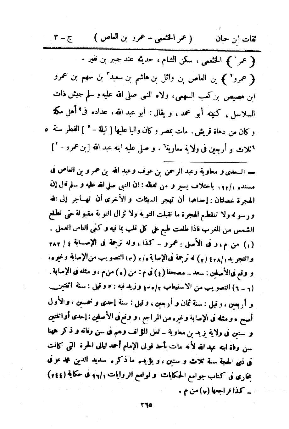 868 - عَمْرو بْن الْعَاصِ بْن وَائِل بْن هَاشم بْن سعيد بْن سهم بْن عَمْرو بْن هصيص بْن كَعْب السَّهْمِي ولاه النَّبِي صَلَّى اللَّهُ عَلَيْهِ وَسَلَّمَ جَيش ذَات السلَاسِل كنيته أَبُو مُحَمَّد وَيُقَال أَبُو عَبْد اللَّه عداده فِي أهل مَكَّة وَكَانَ من دهاة قُرَيْش مَاتَ بِمصْر وَكَانَ واليا عَلَيْهَا لَيْلَة الْفطر سنة ثَلَاث وَأَرْبَعين فِي ولَايَة مُعَاوِيَة وَصلى عَلَيْهِ ابْنه عَبْد اللَّه بْن عَمْرو