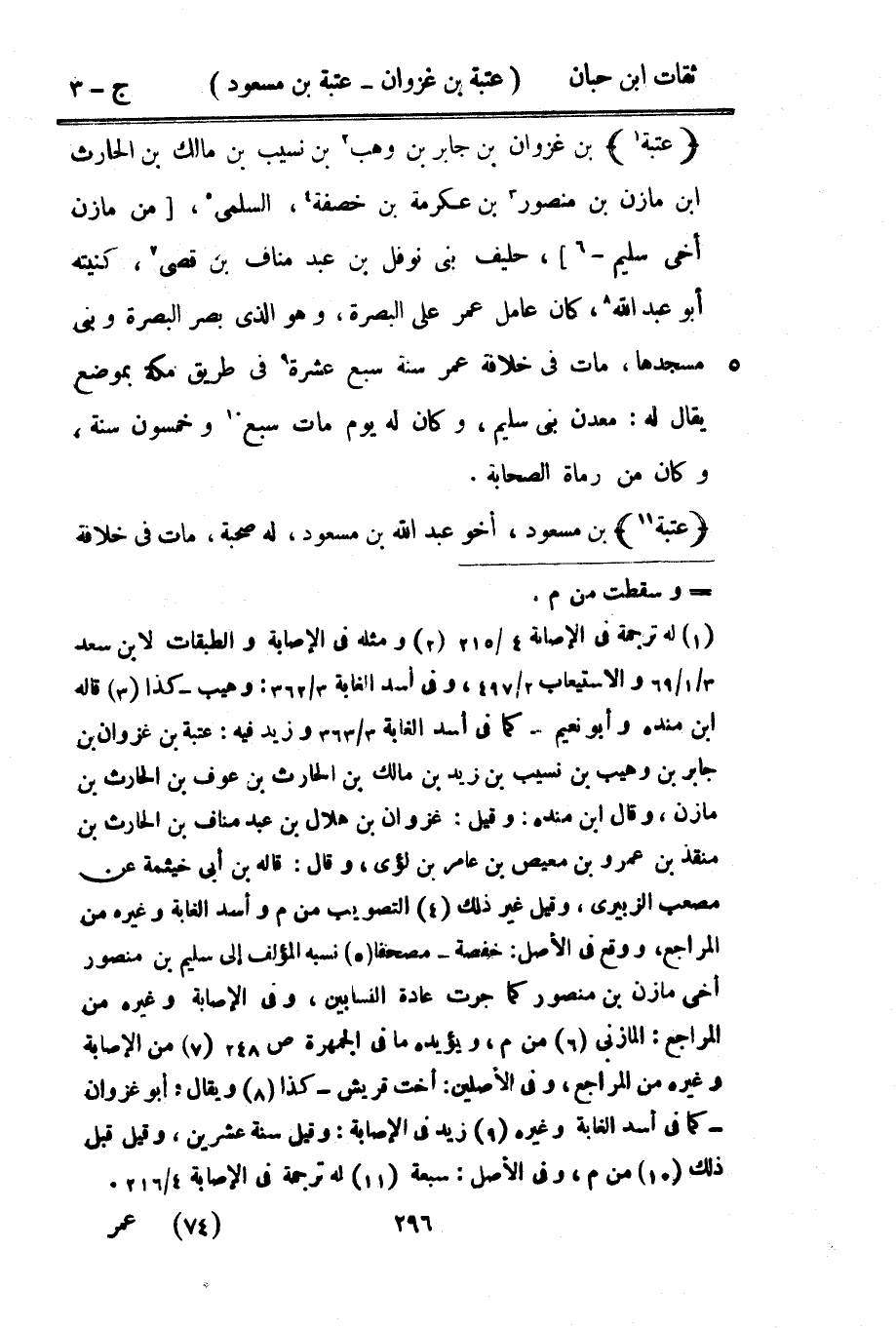 960 - عتبَة بْن غَزوَان بْن جَابر بْن وهب بْن نسيب بْن مَالك بْن الْحَارِث بْن مَازِن بْن مَنْصُور بْن عِكْرِمَة بْن خصفة السّلمِيّ من مَازِن أخي سليم حَلِيف بني نَوْفَل بْن عَبْد منَاف بْن قصي كنيته أَبُو عَبْد اللَّه كَانَ عَامل عمر على الْبَصْرَة وَهُوَ الَّذِي بصر الْبَصْرَة وَبنى مَسْجِدهَا مَاتَ فِي خلَافَة عمر سنة سبع عشرَة فِي طَرِيق مَكَّة بِموضع يُقَال لَهُ مَعْدن بني سليم وَكَانَ لَهُ يَوْم مَاتَ سبع وَخَمْسُونَ سنة وَكَانَ من رُمَاة الصَّحَابَة