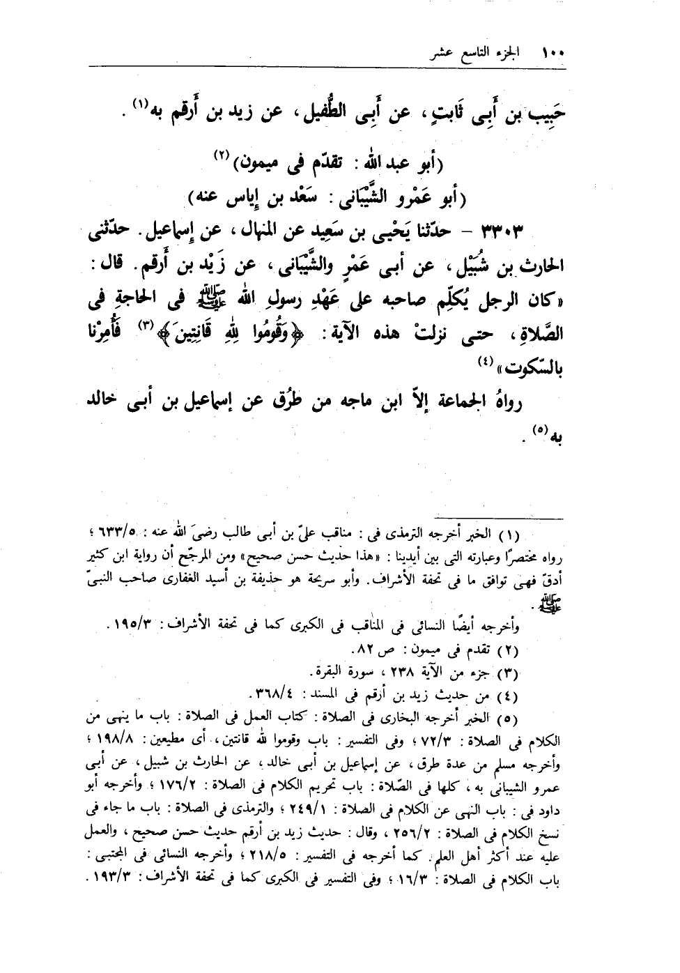 (¬3) الخبر أخرجه البخارى فى الصلاة: كتاب العمل فى الصلاة: باب ما ينهى من الكلام فى الصلاة: 3/72؛ وفى التفسير: باب وقوموا لله قانتين، أى مطيعين: 8/198؛ وأخرجه مسلم من عدة طرق، عن إسماعيل بن أبى خالد، عن الحارث بن شبيل، عن أبى داود فى: باب النهى عن الكلام فى الصلاة: 1/249؛ والترمذى فى الصلاة: باب ما جاء فى نسخ الكلام فى الصلاة: 2/256، وقال: حديث زيد بن أرقم حديث حسن صحيح، والعمل عليه عند أكثر أهل العلم. كما أخرجه فى التفسير: 5/218؛ وأخرجه النسائى فى المجبتى: باب الكلام فى الصلاة: 3/16؛ وفى التفسير فى الكبرى كما فى تحفة الأشراف: 3/193.