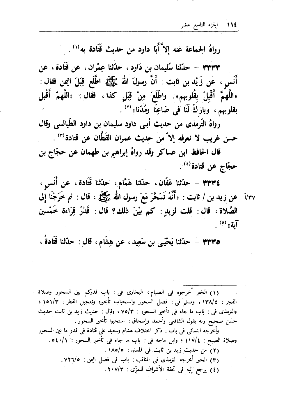 3334 - حدثنا عفان، حدثنا همام، حدثنا قتادة، عن أنسٍ، عن زيد بن / ثابت: «أَنَّهُ تَسَخَّرَ مَعَ رسول الله - صلى الله عليه وسلم -، قال: ثم خَرَجْنَا إِلى الصَّلاة، قال: قلت لزيدٍ: كم بْيَن ذلك؟ قال: قَدْرُ قِرَاءة خَمْسين آية» .