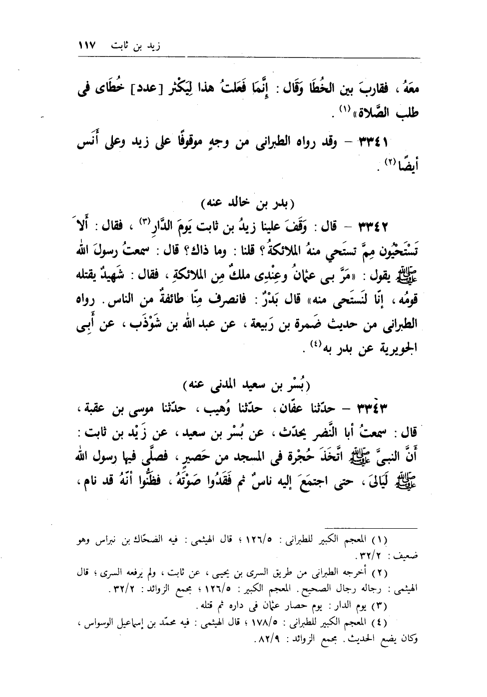 3342 - قال: وقف علينا زيد بن ثابت يوم الدار (¬2) ، فقال: ألا تستحيون مم تستحى منه الملائكة؟ قلنا: وما ذاك؟ قال: سمعت رسول الله - صلى الله عليه وسلم - يقول: «مَرَّ بى عثمانُ وعِندِى ملكٌ من الملائكة، فقال: شهيد يقتله قومه، إنا لنستحى منه» قال بدر: فانصرف منا طائفة من الناس رواه الطبرانى من حديث ضمرة بن ربيعة، عن عبد الله بن شوذب، عن أبى الجويرية عن بدر به (¬3) .