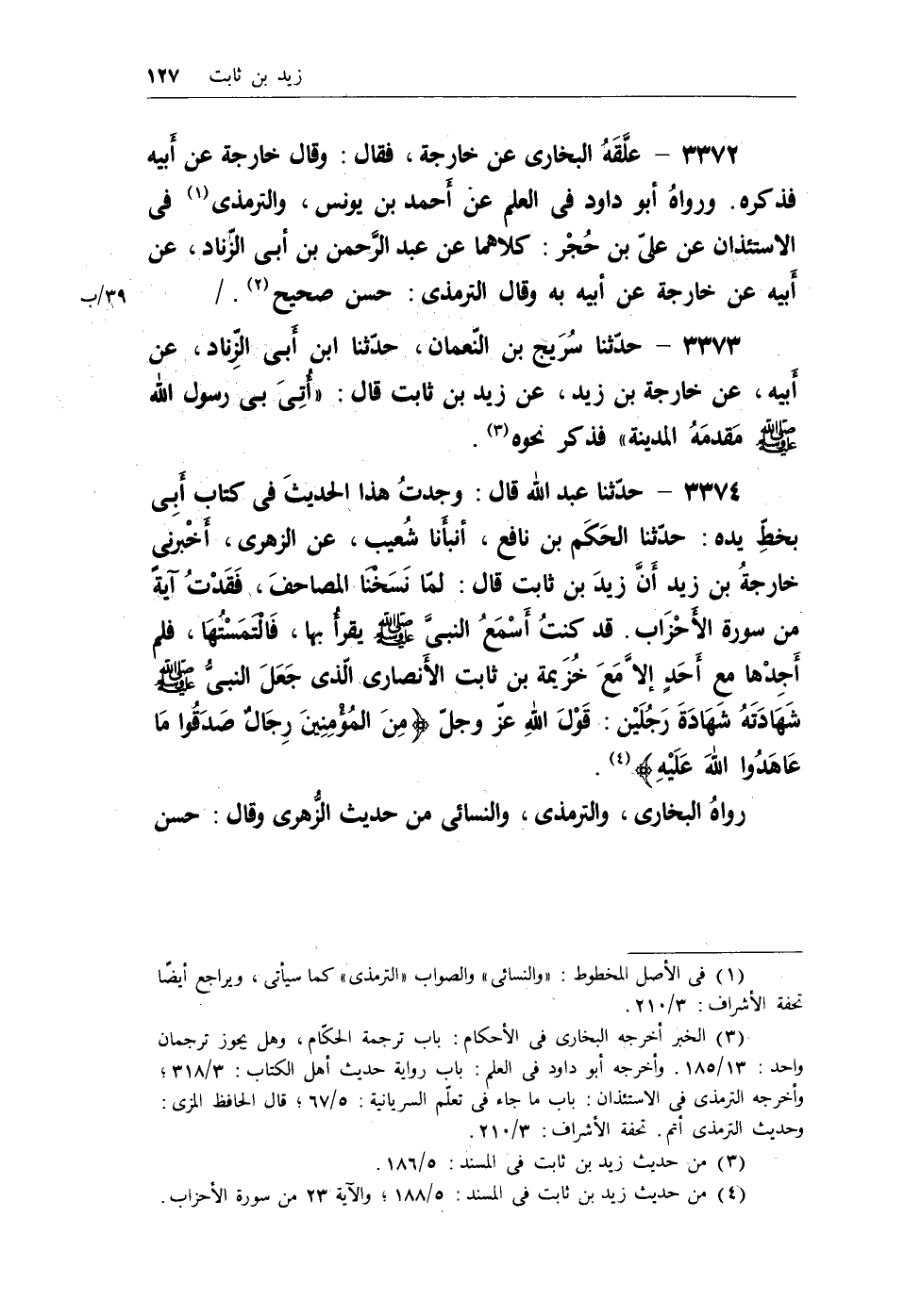 3374 - حدثنا عبد الله قال: وجدت هذا الحديث فى كتاب أبى بخط يده: حدثنا الحكم بن نافع، أنبأنا شعيب، عن الزهرى، أخبرنى خارجة بن زيد أن زيد بن ثابت قال: لما نسخنا المصاحف، فقدت آيةً من سورة الأحزاب. قد كنت أسمع النبى - صلى الله عليه وسلم - يقرأ بها، فالتمستها، فلم أجدها مع أحدٍ إلاَّ مع خزيمة بن ثابت الأنصارى الذى جعل النبى - صلى الله عليه وسلم - شهادته شهادة رجلين: قول الله - عز وجل - {مِنَ الْمُؤْمِنِينَ رِجَالٌ صَدَقُوا مَا عَاهَدُوا اللَّهَ عَلَيْهِ} (¬4) .