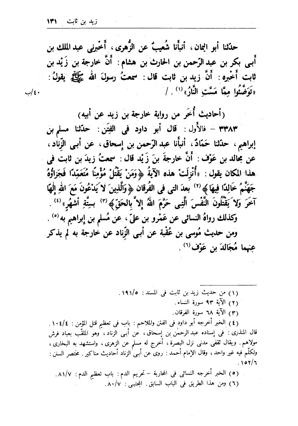 3383 - فالأول: قال أبو داود فى الفتن: حدثنا مسلم بن إبراهيم، حدثنا حماد، أنبأنا عبد الرحمن بن إسحاق، عن أبى الزناد، عن مجالد بن عوف: أن خارجة بن زيد قال: سمعت زيد بن ثابت فى هذا المكان يقول: «أنزلت هذه الآية {وَمَنْ يَقْتُلْ مُؤْمِناً مُتَعَمِّداً فَجَزَاؤُهُ جَهَنَّمُ خَالِداً فِيهَا} (¬1) بعد التى فى الفرقان {وَالَّذِينَ لا يَدْعُونَ مَعَ اللَّهِ إِلَهاً آخَرَ وَلا يَقْتُلُونَ النَّفْسَ الَّتِي حَرَّمَ اللَّهُ إِلا بِالْحَقّ} (¬2) بستة أشهر» (¬3) .