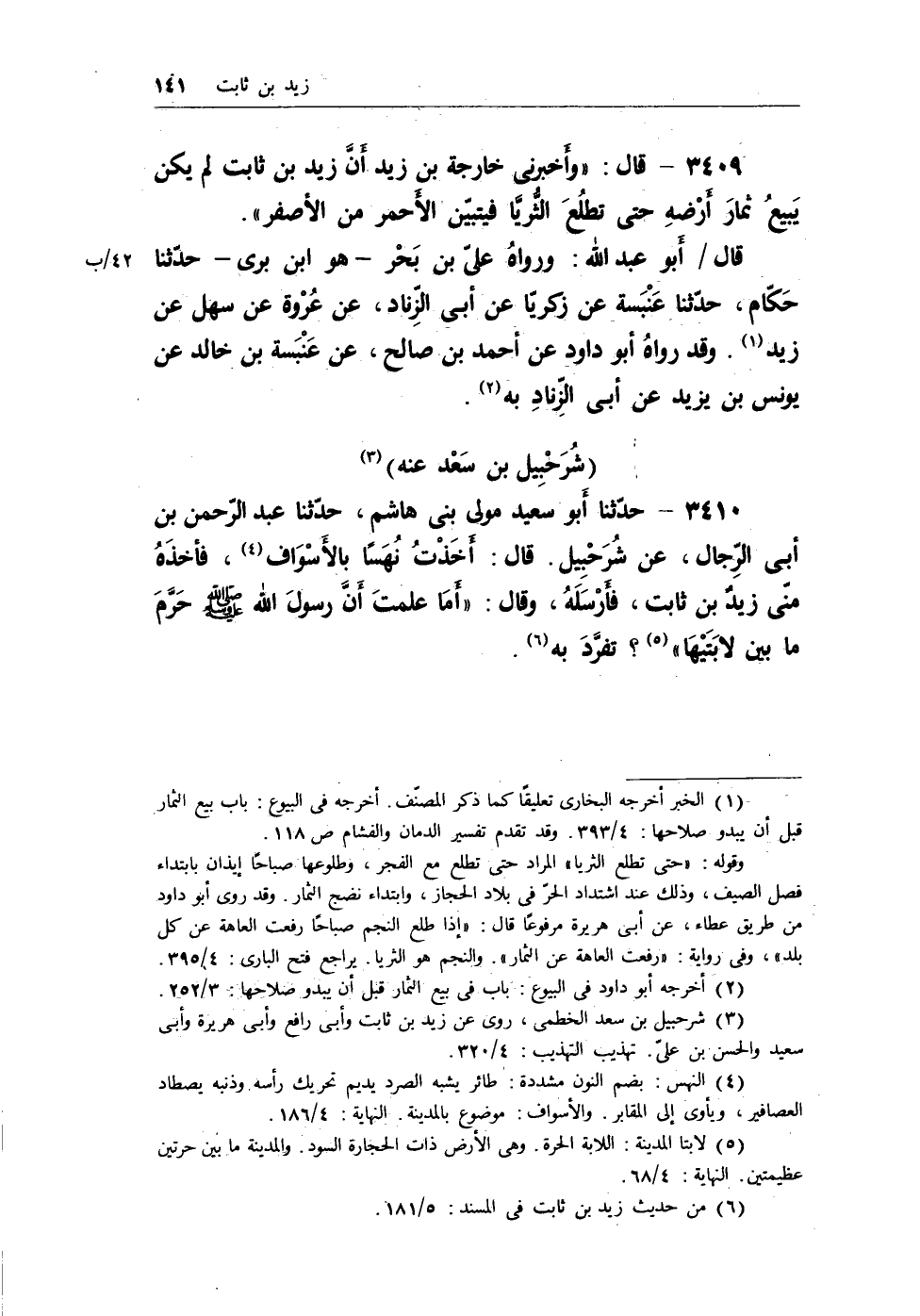 3410 - حدثنا أبو سعيد مولى بن هاشم، حدثنا عبد الرحمن بن أبى الرجال، عن شرحبيل. قال: أخذت نهساً بالأسواف (¬4) ، فأخذه منى زيد بن ثابت، فأرسله، وقال: «أما علمت أن رسول الله - صلى الله عليه وسلم - حرم ما بين لابتيها» (¬5) ؟ تفرد به (¬6) .