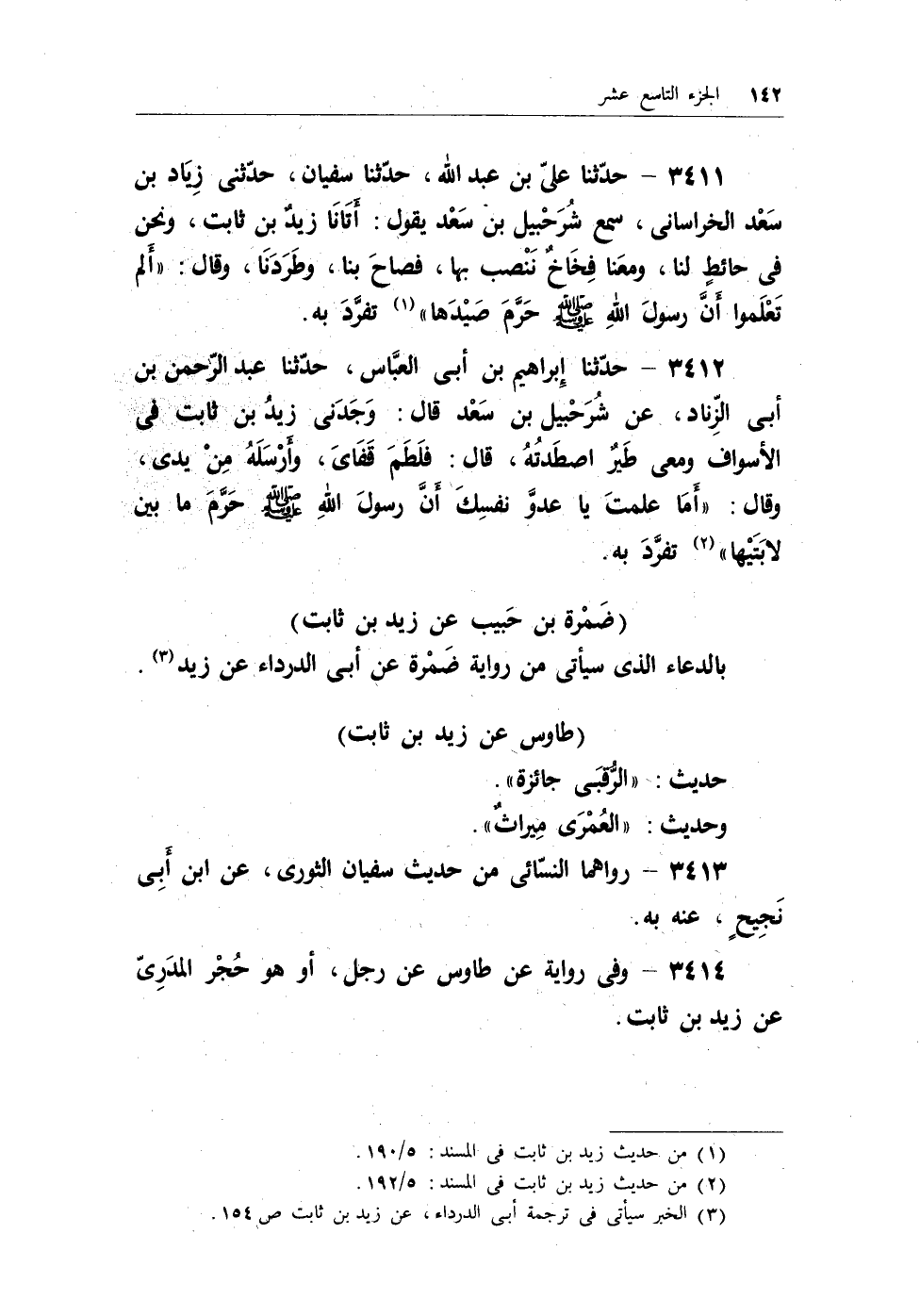 3411 - حدثنا على بن عبد الله، حدثنا سفيان، حدثنى زياد بن سعد الخراسانى، سمع شرحبي بن سعد يقول: أتانا زيد بن ثابت، ونحن فى حائطٍ لنا، ومعنا فخاخ ننصب بها، فصاح بنا، وطردنا، وقال: «ألم تعلموا أن رسول الله - صلى الله عليه وسلم - حرم صيدها» (¬1) تفرد به.