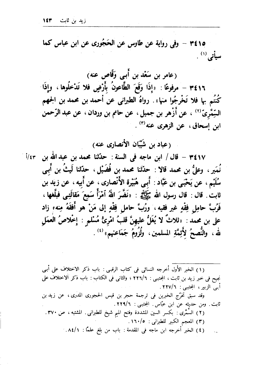 3417 - قال/ ابن ماجه فى السنة: حدثنا محمد بن عبد الله بن نمير، وعلى بن محمد قالا: حدثنا محمد بن فضيل، حدثنا ليث بن أبى سليم، عن يحيى بن عباد: أبى هبيرة الأنصارى، عن أبيه، عن زيد بن ثابت. قال: قال رسول الله - صلى الله عليه وسلم -: «نَضَّرَ اللهُ أمْرَأً سَمِع مَقالَتِى فبلَّغها، فَرُبَّ حامِلِ فقْهٍ غير فقيه، ورُبَّ حاملِ فِقْهٍ إلى مَنْ هو أَفقَهُ مِنه» زاد على بن محمد: «ثلاثٌ لا يُغَلُّ عليهِنَّ قلبُ امْرِئٍ مُسلمٍ: إِخْلاصُ العمَلِ لله، والنُّصحُ لأَئمَّةِ المسلمين، ولُزُومُ جَمَاعتهم» (¬4) .