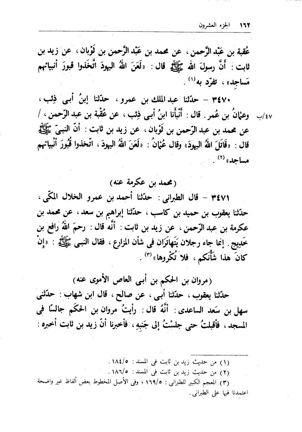 3470 - حدثنا عبد الملك بن عمرو، حدثنا إبن أبى ذئب، وعثمان بن عمر. قال: أَنبأنا ابن أبى ذئب، عن عقبة بن عبد الرحمن، / عن محمد بن عبد الرحمن ابن ثوبان، عن زيد بن ثابت: أن النبى - صلى الله عليه وسلم - قال: «قَاتَلَ اللهُ اليهودَ» وقال عثمان: «لعن الله اليهود، اتخذوا قبور أنبيائهم مساجد» (¬1) .