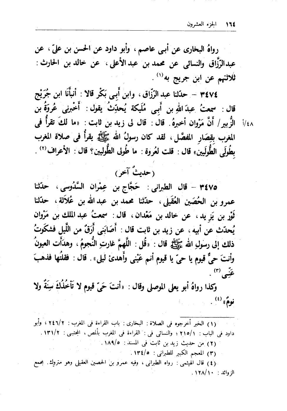 3474 - حدثنا عبد الرزاق، وابن أبى بكر قالا: أنبأنا ابن جريج قال: سمعت عبد الله بن أبى ملكية يحدث يقول: أخبرنى عروة بن الزبير/ أن مروان أخبره. قال: قال لى زيد بن ثابت: «ما لك تقرأ فى المغرب بقصار المفصل، لقد كان رسول الله - صلى الله عليه وسلم - يقرأ فى صلاة المغرب بطولى الطوليين» قال: قلت لعروة: ما طولى الطوليين؟ قال: الأعراف (¬1) .