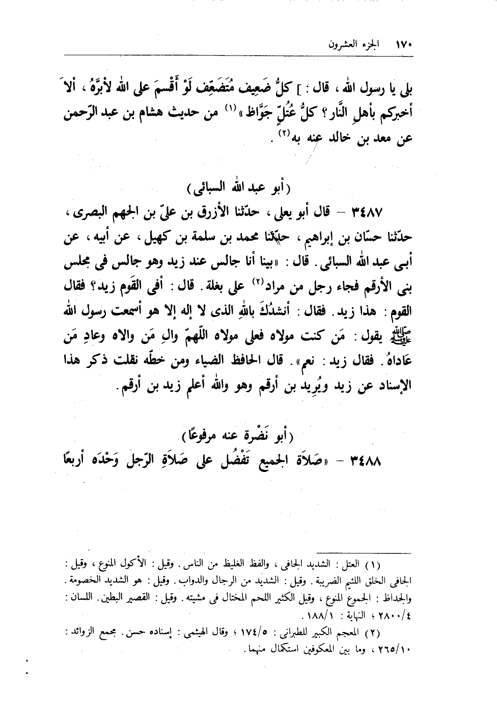 3487 - قال أبو يعلى، حدثنا الأزرق بن على بن الجهم البصرى، حدثنا حسان بن إبراهيم، حدثنا محمد بن سلمة بن كهيل، عن أبيه، عن أبى عبد الله السبائى. قال: «بينا أنا جالس عند زيد وهو جالس فى مجلس بنى الأرقم فجاء رجل من مراد على بغلة. قال: أفى القوم زيد؟ فقال القوم: هذا زيد. فقال: أنشدك بالله الذى لا إله إلا هو أسمعت رسول الله - صلى الله عليه وسلم - يقول: من كنت مولاه فعلى مولاه اللهم وال من والاه وعاد من عاداه. فقال زيد: نعم» . قال الحافظ الضياء ومن خطة نقلت ذكر هذا الإسناد عن زيد ويريد بن أرقم وهو والله أعلم زيد بن أرقم.