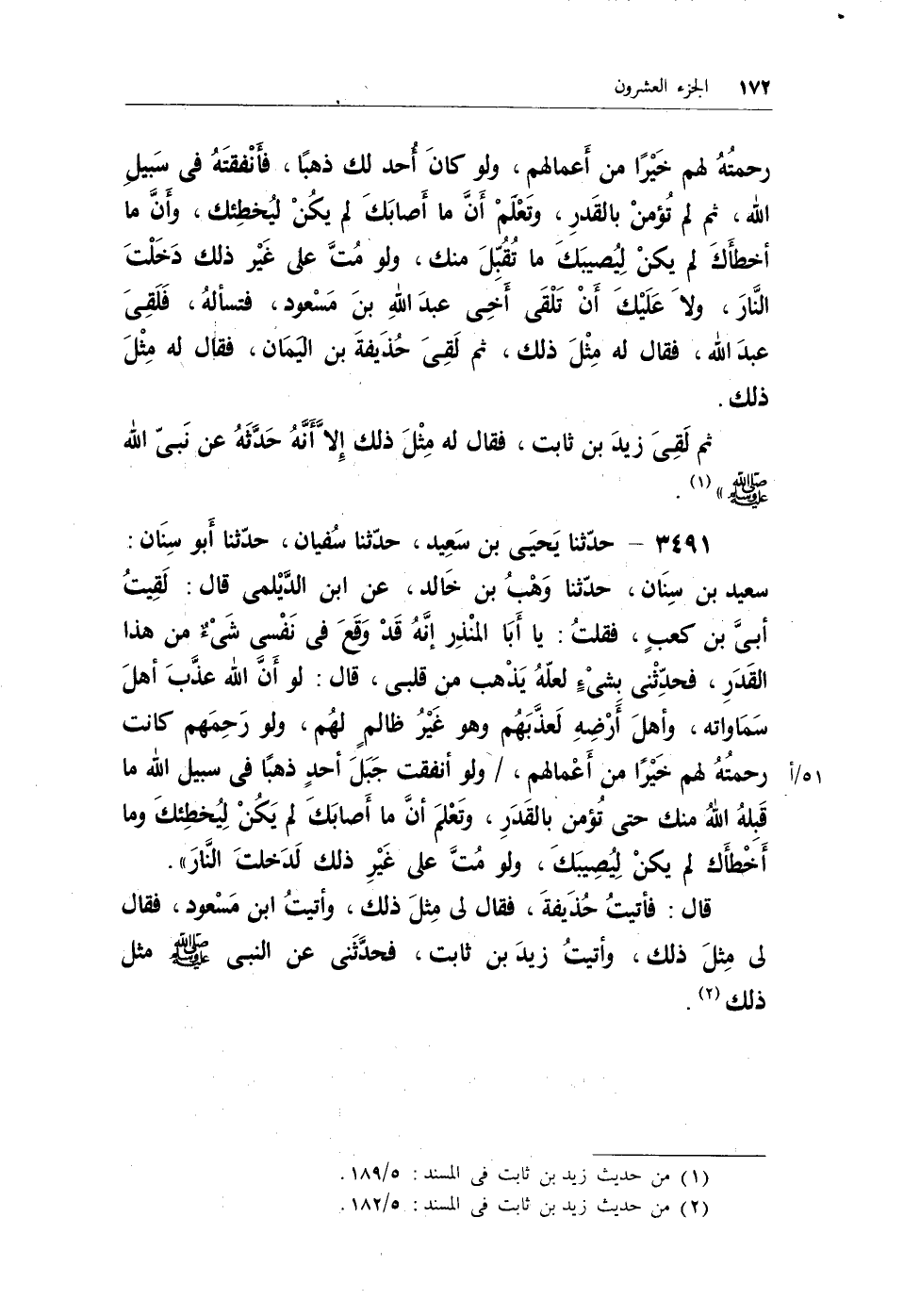 رحمته لهم خيراً من أعمالهم، ولو كان أحد لك ذهباً، فأنفقته فى سبيل الله، ثم لم تؤمن بالقدر، وتعلم أن ما أصابك لم يكن ليخطئك، وأن ما أخطأك لم يكن ليصيبك ما تقبل منك، ولو مت على غير ذلك دخلت النار، ولا عليك أن تلقى أخى عبد الله بن مسعود، فتسأله، فلقى عبد الله، فقال له مثل ذلك، ثم لقى حذيفة بن اليمان، فقال له مثل ذلك.