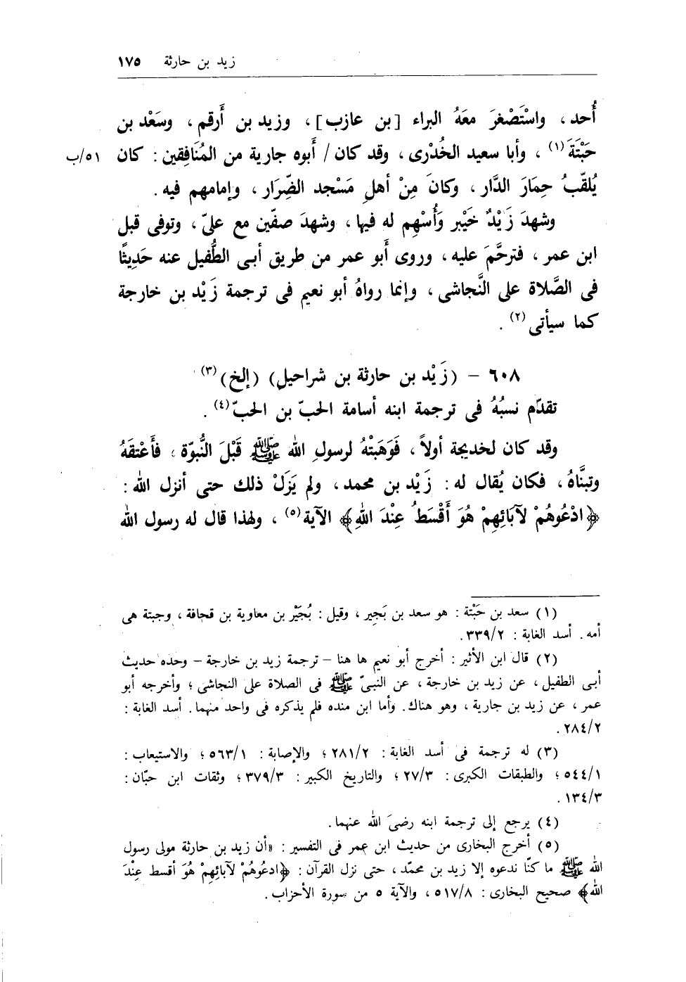 (¬3) أخرج البخارى من حديث ابن عمر فى التفسير: «أن زيد بن حارثة مولى رسول الله - صلى الله عليه وسلم - ما كنا ندعوه إلا زيد بن محمد، حتى نزل القرآن: {ادْعُوهُمْ لآبَائِهِمْ هُوَ أَقْسَطُ عِنْدَ اللَّهِ} صحيح البخارى: 8/517، والآية 5 من سورة الأحزاب.