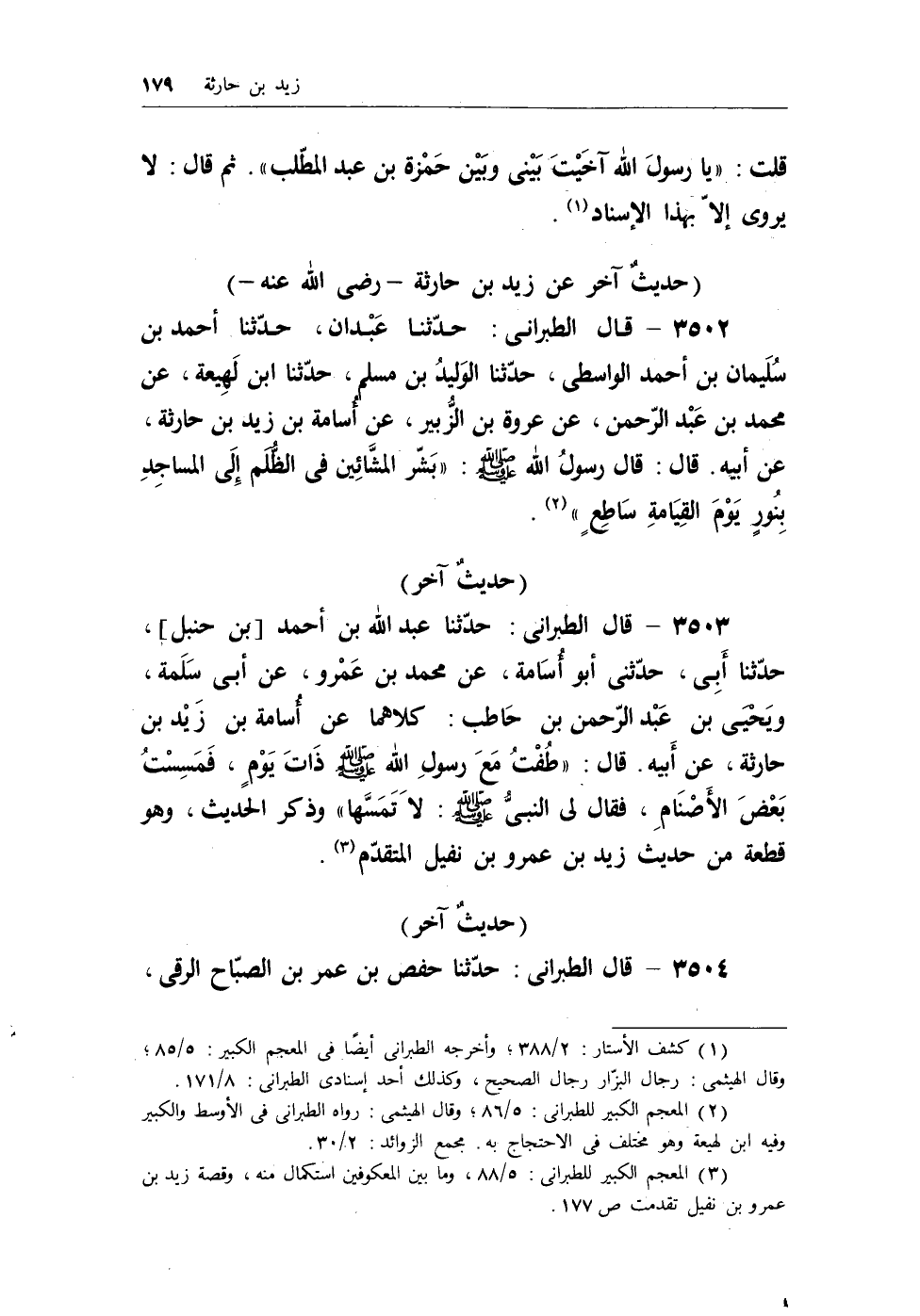 3503 - قال الطبرانى: حدثنا عبد الله بن أحمد [بن حنبل] ، حدثنا أبى، حدثنى أبو أسامة، عن محمد بن عمرو، عن أبى سلمة، ويحيى بن عبد الرحمن بن حاطب: كلاهما عن أسامة بن زيد بن حارثة، عن أبيه. قال: «طُفْتُ معَ رسول الله - صلى الله عليه وسلم - ذات يومٍ، فمسستُ بعض الأصنام، فقال لى النبى - صلى الله عليه وسلم -: لا تمسها» وذكر الحديث، وهو قطعة من حديث زيد بن عمرو بن نفيل المتقدم (¬2) .