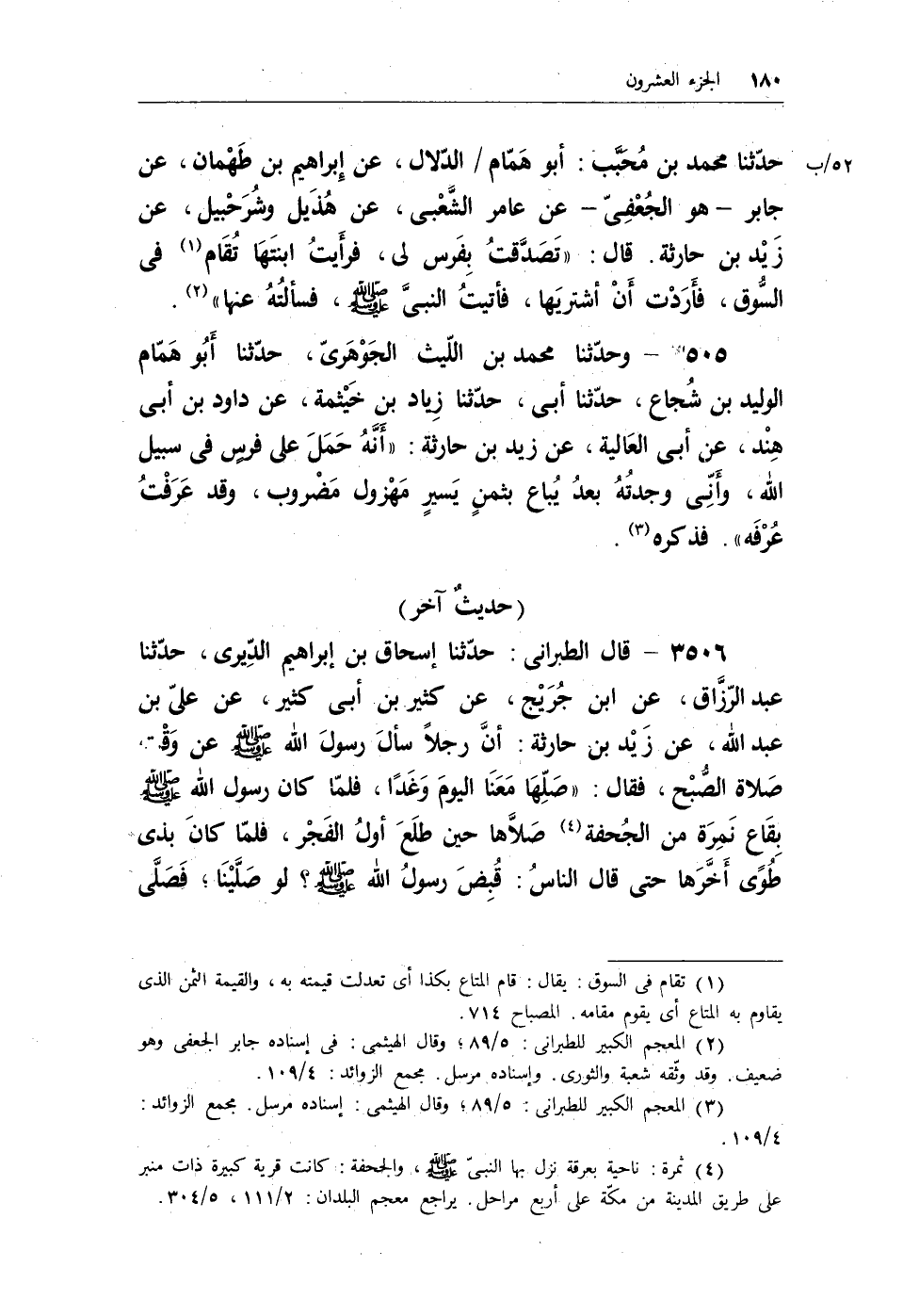 حدثنا محمد ابن محبب: أبو همام/ الدلال، عن إبراهيم بن طهمان، عن جابر ـ هو الجعفى ـ عن عامر الشعبى، عن هذيل وشرحبيل، عن زيد بن حارثة. قال: «تصدقت بفرس لى، فرأيت ابنتها تقام (¬1) فى السوق، فأردت أن أشتريها، فأتيت النبى - صلى الله عليه وسلم -، فسألُتهُ عنها» (¬2) .