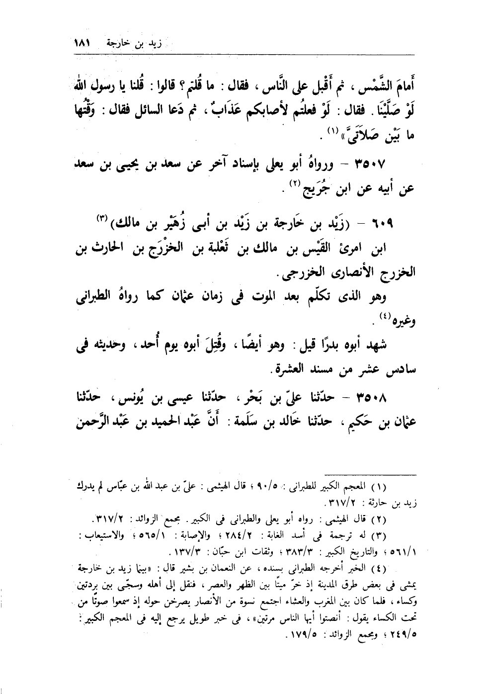 (¬3) الخبر أخرجه الطبرانى بسنده، عن النعمان بن بشير قال: «بينما زيد بن خارجة يمشى فى بعض طرق المدينة إذ خرّ ميتاً بين الظهر والعصر، فنقل إلى أهله وسجى بين بردتين وكساء، فلما كان بين المغرب والعشاء اجتمع نسوة من الأنصار يصرخن حوله إذ سمعوا صوتاً من تحت الكساء يقول: أنصتوا أيها الناس مرتين» ، فى خبر طويل يرجع إليه فى المعجم الكبير: 5/249؛ ومجمع الزوائد: 5/179.