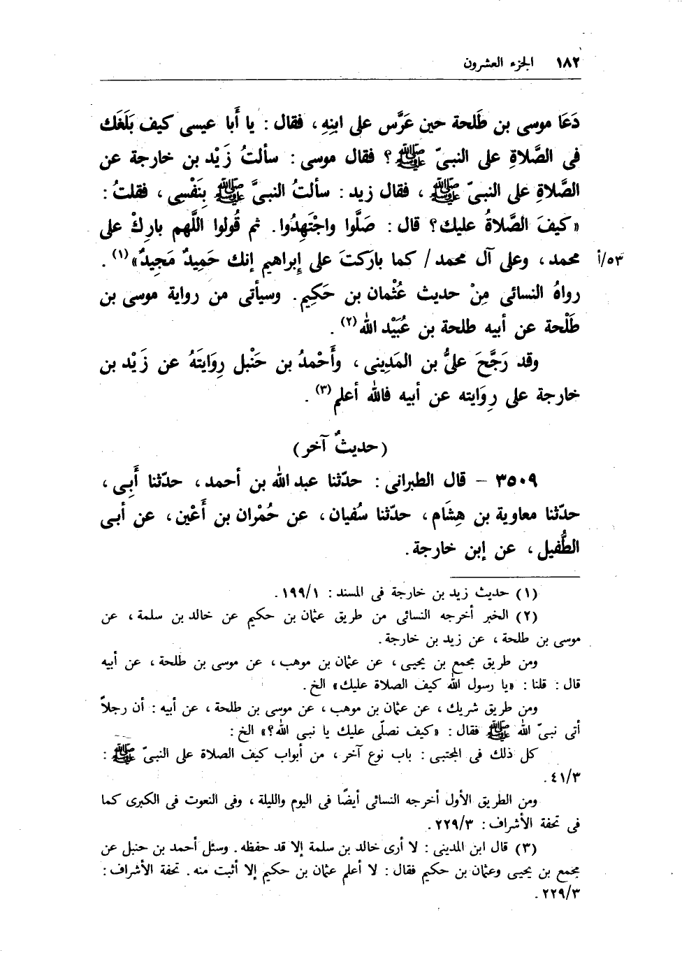ومن طريق مجمع بن يحيى، عن عثمان بن موهب، عن موسى بن طلحة، عن أبيه قال: قلنا: «يا رسول الله كيف الصلاة عليك» الخ.