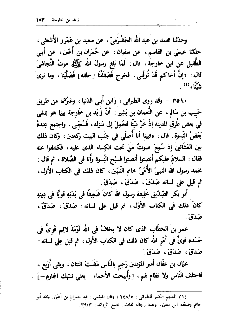 3510 - وقد روى الطبرانى، وابن أبى الدنيا، وغيرهما من طريق حبيب بن سالم، عن النعمان بن بشير: أن زيد بن خارجة بينما هو يمشى فى بعض طرق المدينة إذ خرج ميتاً فحمل إلى منزله، فسجى، واجتمع عنده بعض النسوة. قال: «فبينا أنا أصلى فى جنب البيت ركعتين، وكان ذلك بين العشائين إذ سمع صوت من تحت الكساء الذى عليه، فكشفوا عنه فقال: السلام عليكم أنصتوا أنصتوا فسبح النسوة وأنا فى الصلاة، ثم قال: محمد رسول الله النبى الأمى خاتم النبيين، كان ذلك فى الكتاب الأول، ثم قيل على لسانه صدق، صدق، صدق.