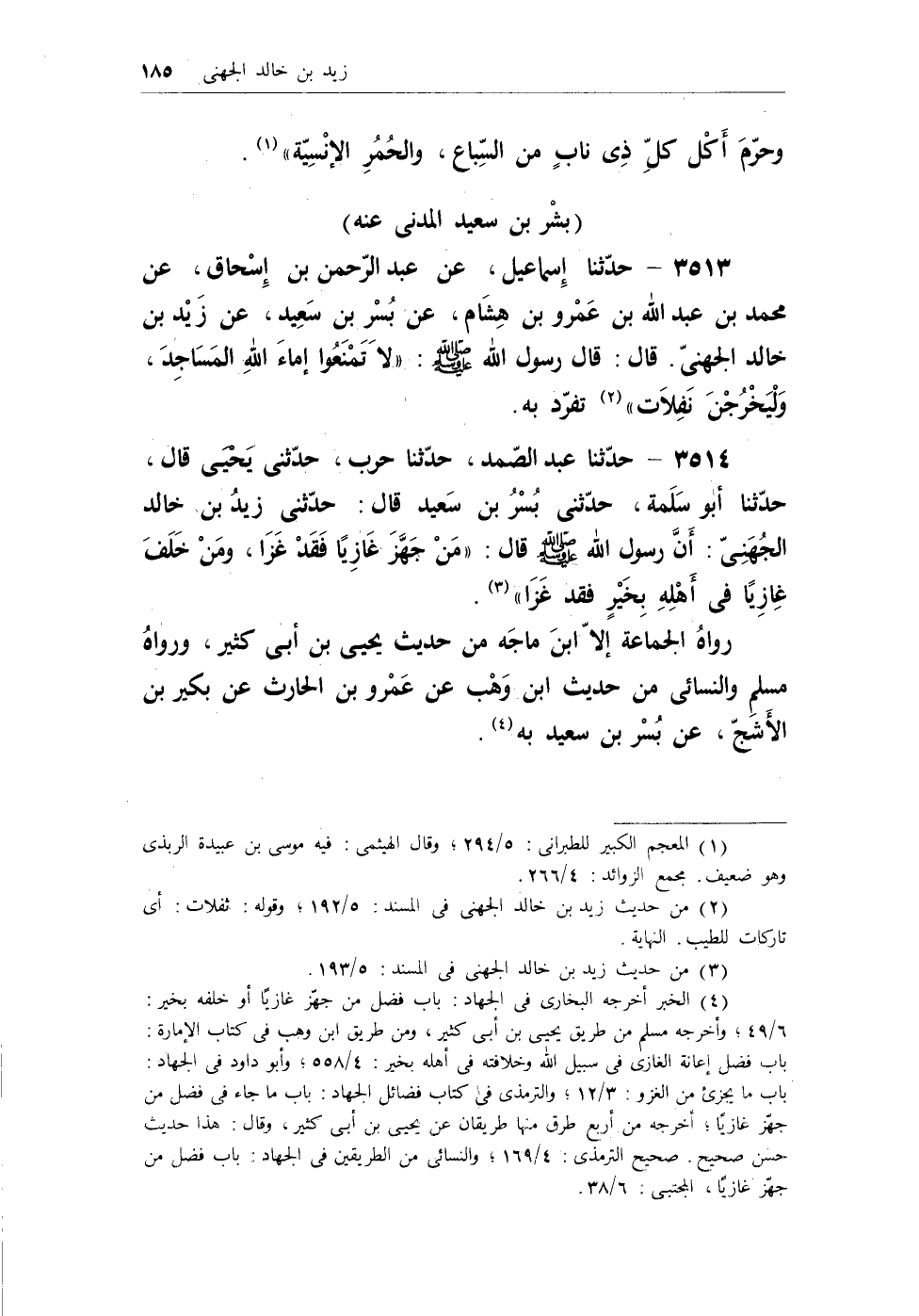 3514 - حدثنا عبد الصمد، حدثنا حرب، حدثنى يحيى قال، حدثنا أبو سلمة، حدثنى بسر بن سعيد قال: حدثنى زيد بن خالد الجهنى: أن رسول الله - صلى الله عليه وسلم - قال: «مَنْ جَهَّزَ غَازياً فَقَدْ غَزَا، ومَنْ خَلَفَ غازياً فى أهلهِ بخيرٍ فقد غَزَا» (¬2) .