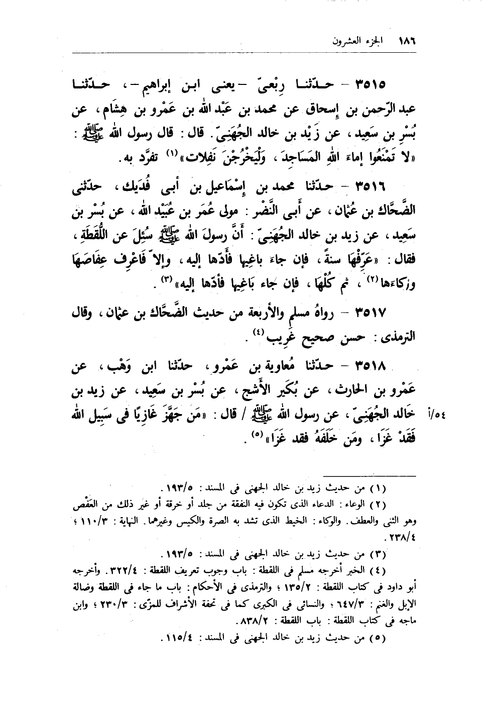 3516 - حدثنا محمد بن إسماعيل بن أبى فديك، حدثنى الضحاك بن عثمان، عن أبى النضر: مولى عمر بن عبيد الله، عن بسر بن سعيد، عن زيد بن خالد الجهنى: أن رسول - صلى الله عليه وسلم - سئل عن اللقطة، فقال: «عَرّفْهَا سنةً، فإن جاءَ باغِيها فأَدّها إليه، وإلاّ فَاعْرِف عِفَاصَهَا ووكاءها (¬2) ، ثم كلها، فإن جاء باغيها فأدها إليه» (¬3) .