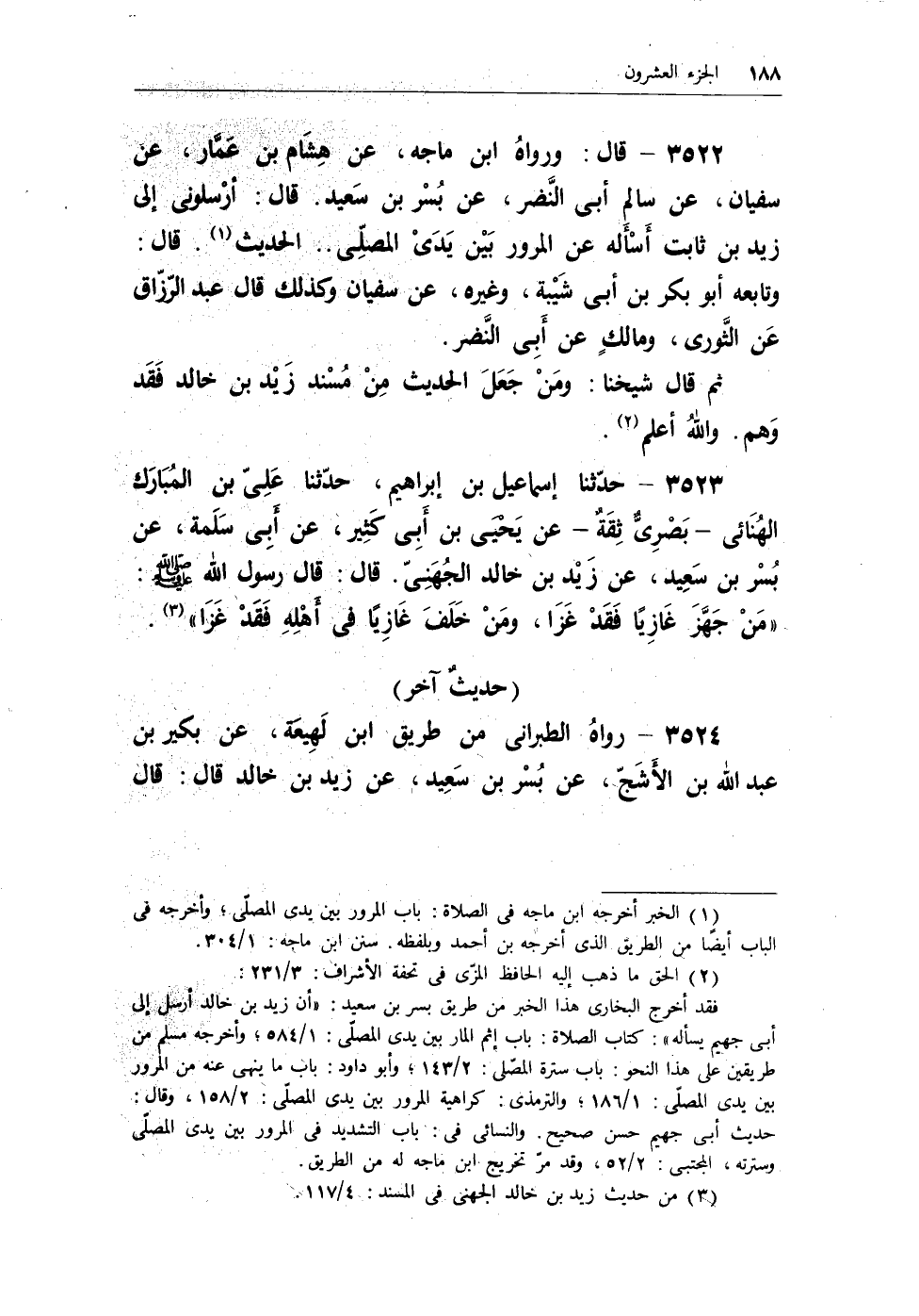 فقد أخرج البخارى هذا الخبر من طريق بسر بن سعيد: «أن زيد بن خالد أرسل إلى أبى جهيم يسأله» : كتاب الصلاة: باب إثم المار بين يدى المصلى: 1/584؛ وأخرجه مسلم من طريقين على هذا النحو: باب سترة المصلى: 2/143؛ وأبو داود: باب ما ينهى عنه من المرور بين يدى المصلى: 1/186؛ والترمذى: كراهية المرور بين يدى المصلى: 2/158، وقال: حديث أبى جهيم حسن صحيح. والنسائى فى: باب التشديد فى المرور بين يدى المصلى وسترته، المجتبى: 2/52، وقد مر تخريج ابن ماجه له من الطريق.