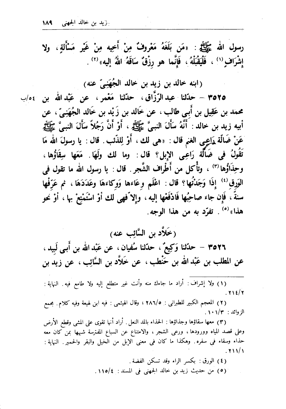 3525 - حدثنا عبد الرزاق، حدثنا معمر، عن عبد الله بن محمد بن عقيل ابن أبى طالب، عن خالد بن زيد بن خالد الجهنى، عن أبيه زيد بن خالد: أنه سأل النبى - صلى الله عليه وسلم -، أَوْ أَنَّ رجلاً سأل النبى - صلى الله عليه وسلم - عن ضَالّة راعى الغنم قال: «هى لك، أو للذئب. قال: يا رسول الله ما تقول فى ضالة راعى الإبل؟ قال: وما لك ولها. معها سقاؤها، وحذاؤها (¬1) ، وتأكل من أطراف الشجر. قال: يا رسول الله ما تقول فى الورق (¬2) إذا وجدتها؟ قال: اعلم وعَاءَها وَوِكاءَهَا وعَدَدَهَا، ثم عَرّفْها سنةً، فإن جاء صاحبها فَادْفَعْها إليه، وإِلاّ فهى لك أوْ استمتع بها، أو نحو هذا» (¬3) تفرد به من هذا الوجه.