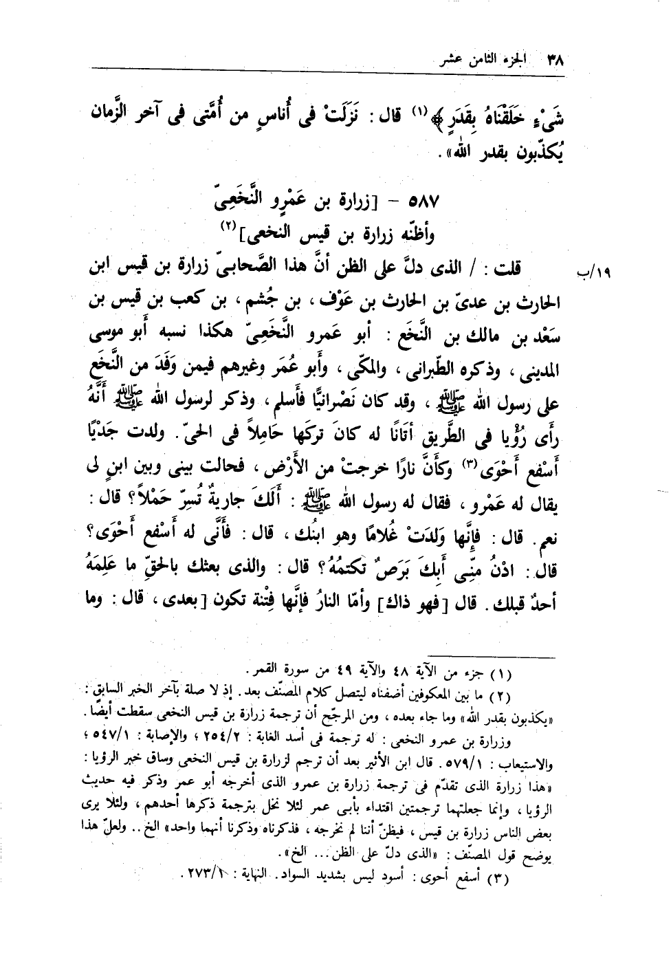 قلت: / الذى دلَّ على الظن أنَّ هذا الصَّحابىّ زرارة بن قيس ابن الحارث بن عدى بن الحارث بن عوف، بن جشم، بن كعب بن قيس بن سعد بن مالك بن النخع: أبو عمرو النخعى هكذا نسبه أبو موسى المدينى، وذكره الطبرانى، والمكى، وأبو عمر وغيرهم فيمن وفد من النخع على رسول الله - صلى الله عليه وسلم -، وقد كان نصرانياً فأسلم، وذكر لرسول الله - صلى الله عليه وسلم - أنه رأى رويا فى الطريق أتانا له كان تركها حاملاً فى الحى. ولدت جدياً أسفع أحوى (¬2) وكأنَّ ناراً خرجت من الأرض، فحالت بينى وبين ابن لى يقال له عمرو، فقال له رسول الله - صلى الله عليه وسلم -: ألك جارية تسر حملاً؟ قال: نعم. قال: فإنها ولدت غلاماً وهو ابنك، قال: فأنى له أسفع أحوى؟ قال: ادن منى أبك برص تكتمه؟ قال: والذى بعثك بالحق ما علمه أحد قبلك. قال [فهو ذاك] وأما النار فإنها فتنة تكون [بعدى، قال: وما