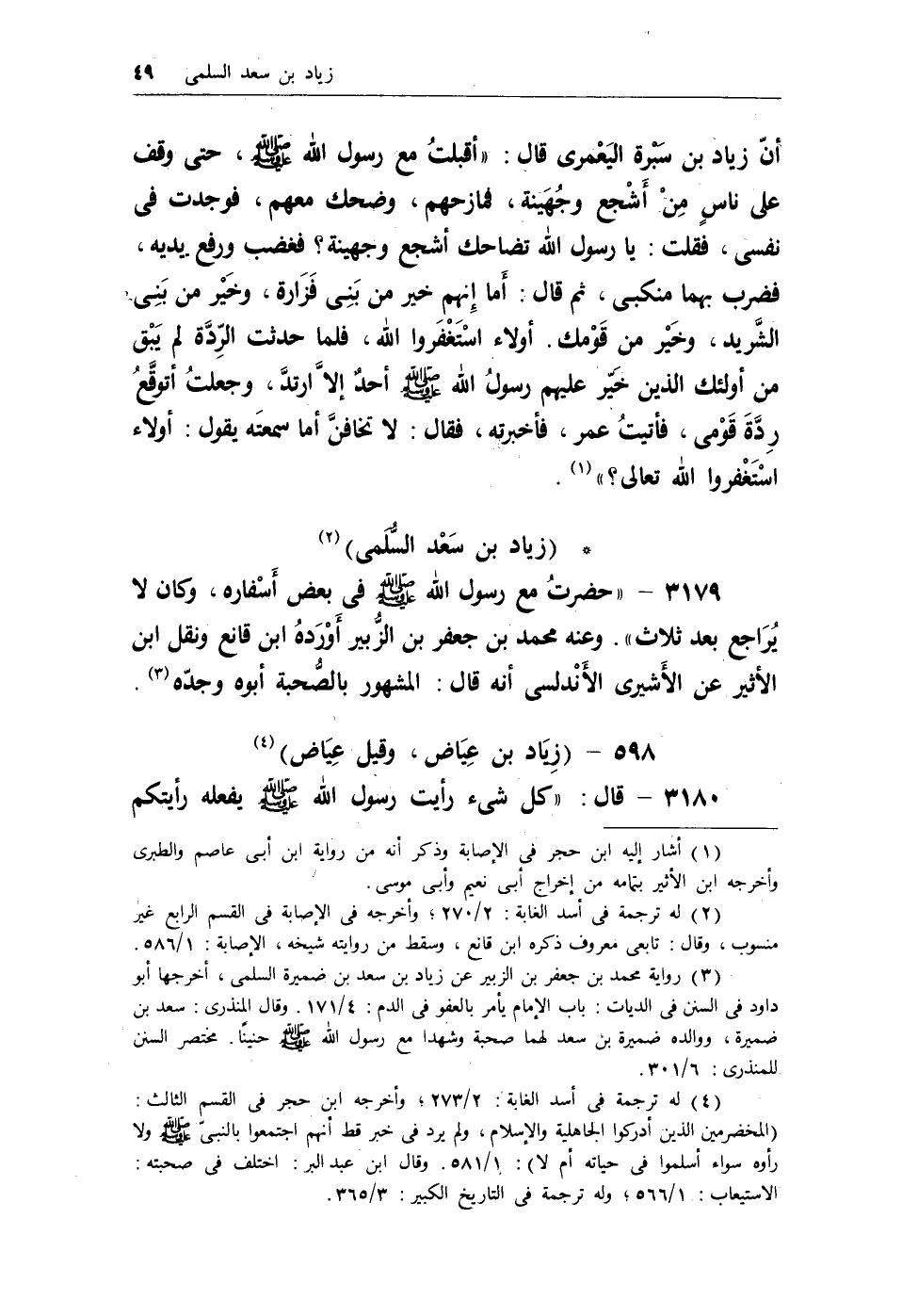 (¬1) رواية محمد بن جعفر بن الزبير عن زياد بن سعد بن ضميرة السلمى، أخرجها أبو داود فى السنن فى الديات: باب الإمام يأمر بالعفو فى الدم: 4/171. وقال المنذرى: سعد بن ضميرة، ووالده ضميرة بن سعد لهما صحبة وشهدا مع رسول الله - صلى الله عليه وسلم - حنيناً. مختصر السنن للمنذرى: 6/301.