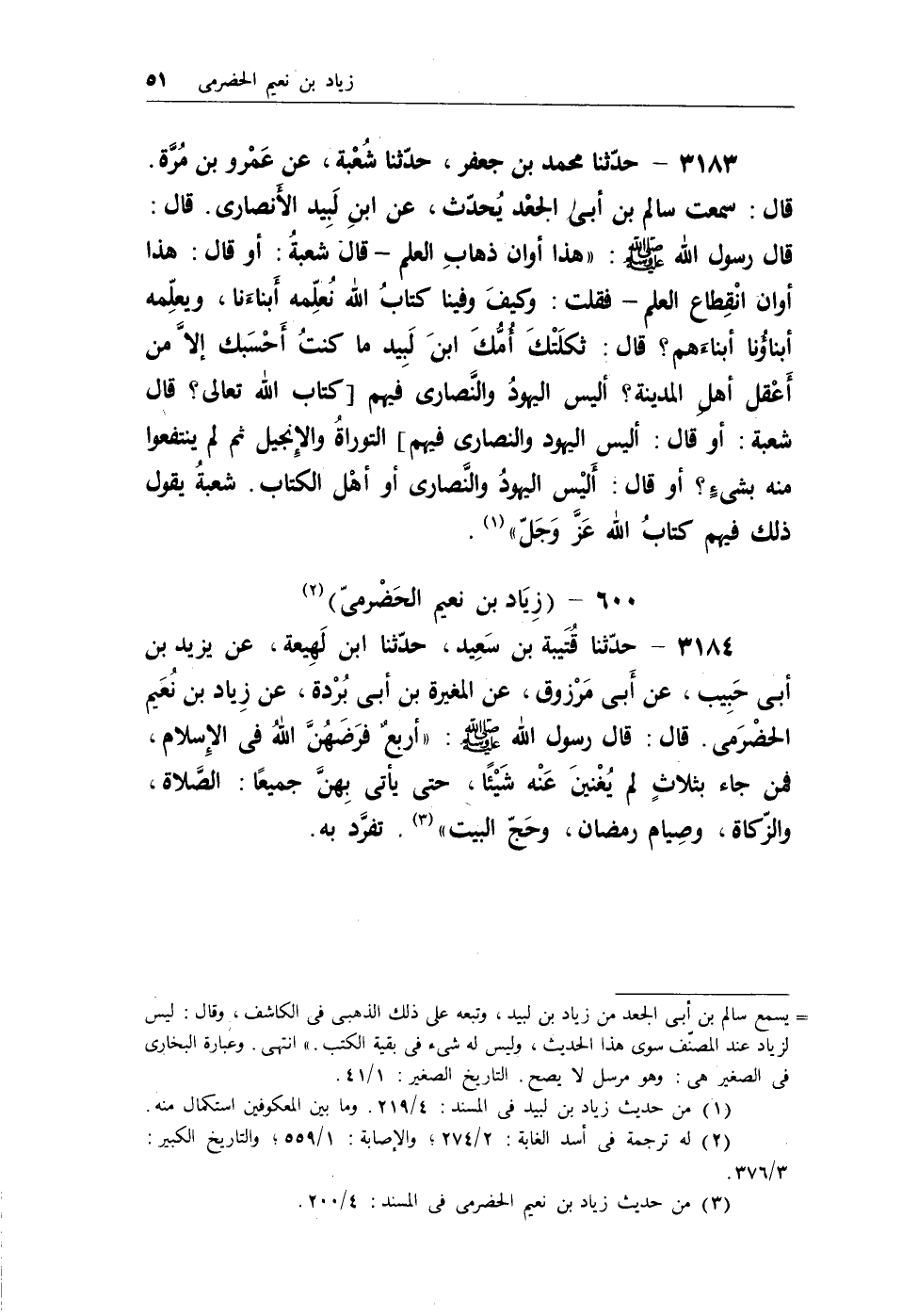 (¬3) من حديث زياد بن نعيم الحضرمى فى المسند: 4/200.