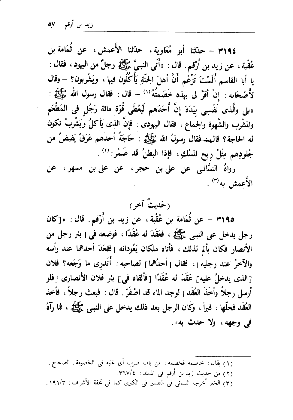 3194- حدثنا أبو معاوية، حدثنا الأعمش، عن ثُمامة بن عقبة، عن زيد بن أرقم. قال: «أتى النبى - صلى الله عليه وسلم - رجلٌ من اليهود، فقال: يا أبا القاسم أَلَسْتَ تَزْعُم أَنَّ أهلَ الجنّةِ يَأْكُلُون فيها، ويَشْربون؟ ـ وقال لأَصْحَابه: إِنْ أقرَّ لى بهذه خَصَمتُهُ (¬1) ـ قال: فقال رسول الله - صلى الله عليه وسلم -: «بلى والَّذى نَفْسى بِيَدَهَ إِنَّ أَحَدَهم لَيُعْطَى قُوّة مائة رَجُلٍ فى المَطْعَم والمشْرب والشَّهوة والجماع، فقال اليهودى: فإِنَّ الذى يَأكلُ ويَشْربُ تكون له الحاجة؟ قال: فقال رسولُ الله - صلى الله عليه وسلم -: حَاجَةُ أحدهم عَرَقٌ يَفيضُ من جُلودِهم مِثْلُ رِيح المسْكِ، فإذا البطنُ قد ضَمُر» (¬2) .