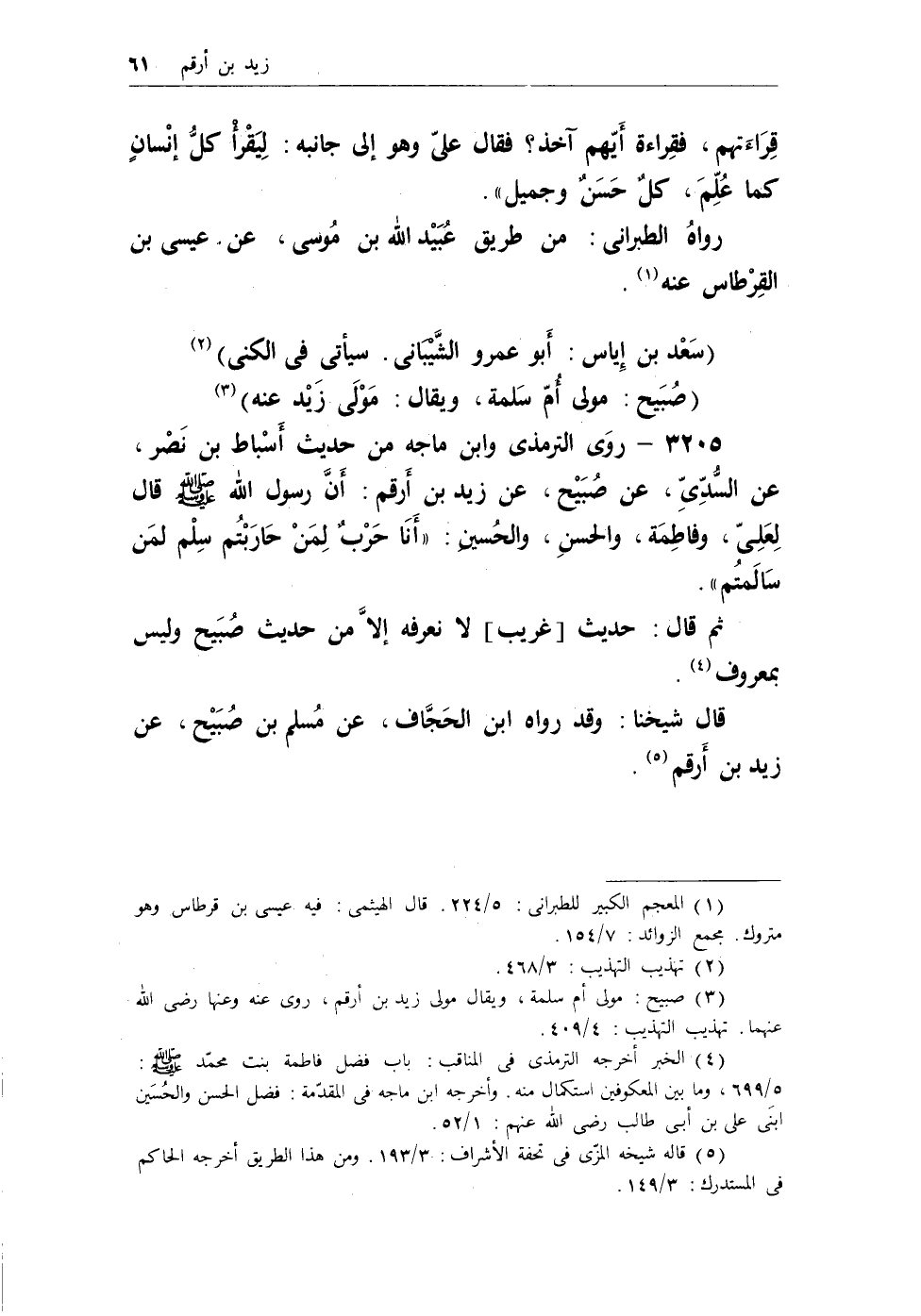 3205- روى الترمذى وابن ماجه من حديث أسباط بن نصر، عن السدى، عن صبيح، عن زيد بن أرقم: أن رسول الله - صلى الله عليه وسلم - قال لعلىَ، وفاطمة، والحسن، والحسين: «أَنَا حَرْبٌ لِمَنْ حَارَبْتُم سِلْم لمَن سَالَمتُم» .