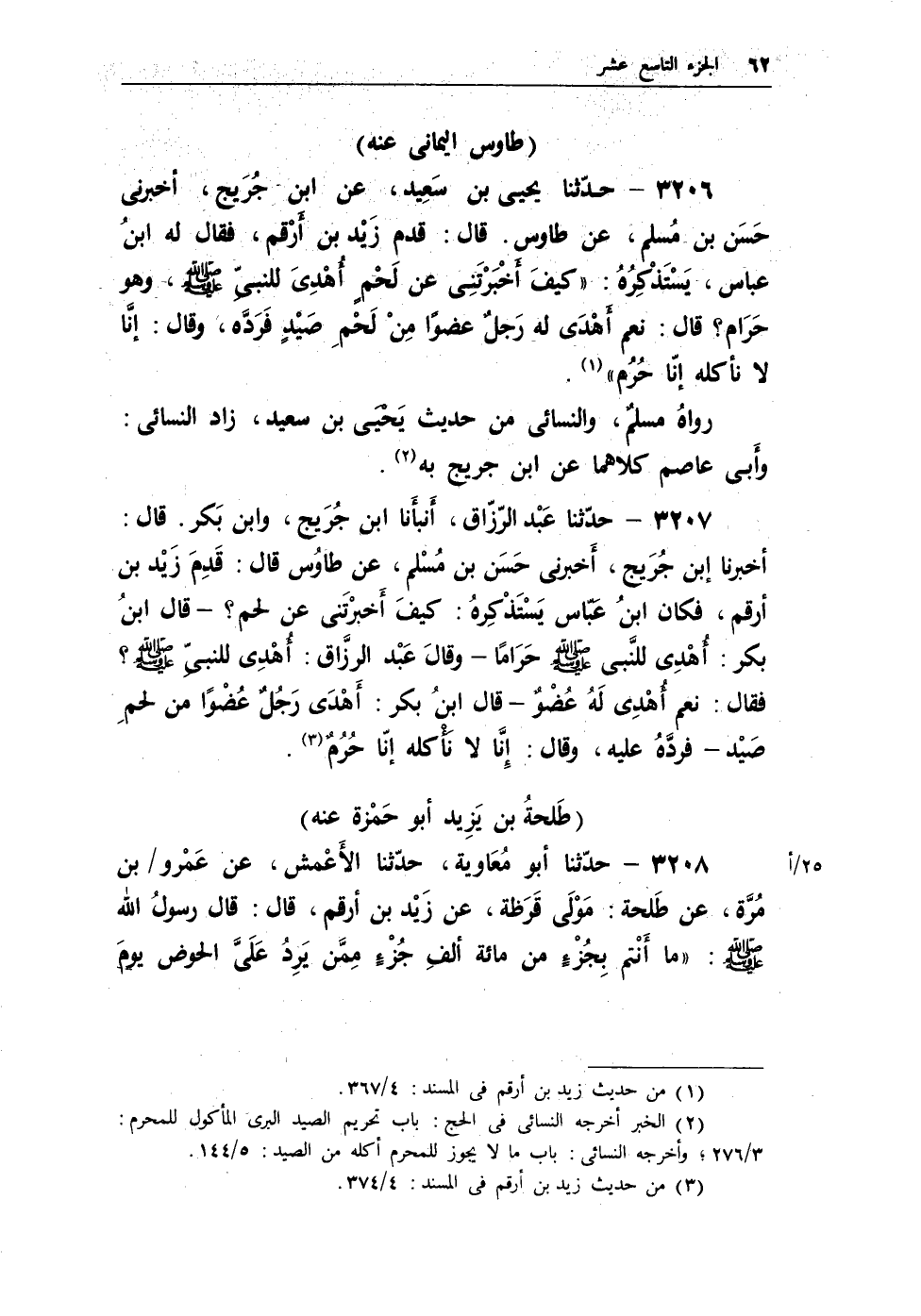 3207- حدثنا عبد الرزاق، أنبأنا ابن جريج، وابن بكر. قال: أخبرنا إبن جريج، أخبرنى حسن بن مسلم، عن طاوس قال: قدم زيد بن أرقم، فكان ابن عباس يستذكره: كيف أخبرتنى عن لحم؟ ـ قال ابن بكر: أهدى للنبى - صلى الله عليه وسلم - حراماً ـ وقال عبد الرزاق: أهدى للنبى - صلى الله عليه وسلم -؟ فقال: نعم أهدى له عضوٌ ـ قال ابن بكر: أهدى رجل عضواً من لحم صيد ـ فرده عليه، وقال: إنا لا نأكله إنا حُرُمٌ (¬3) .