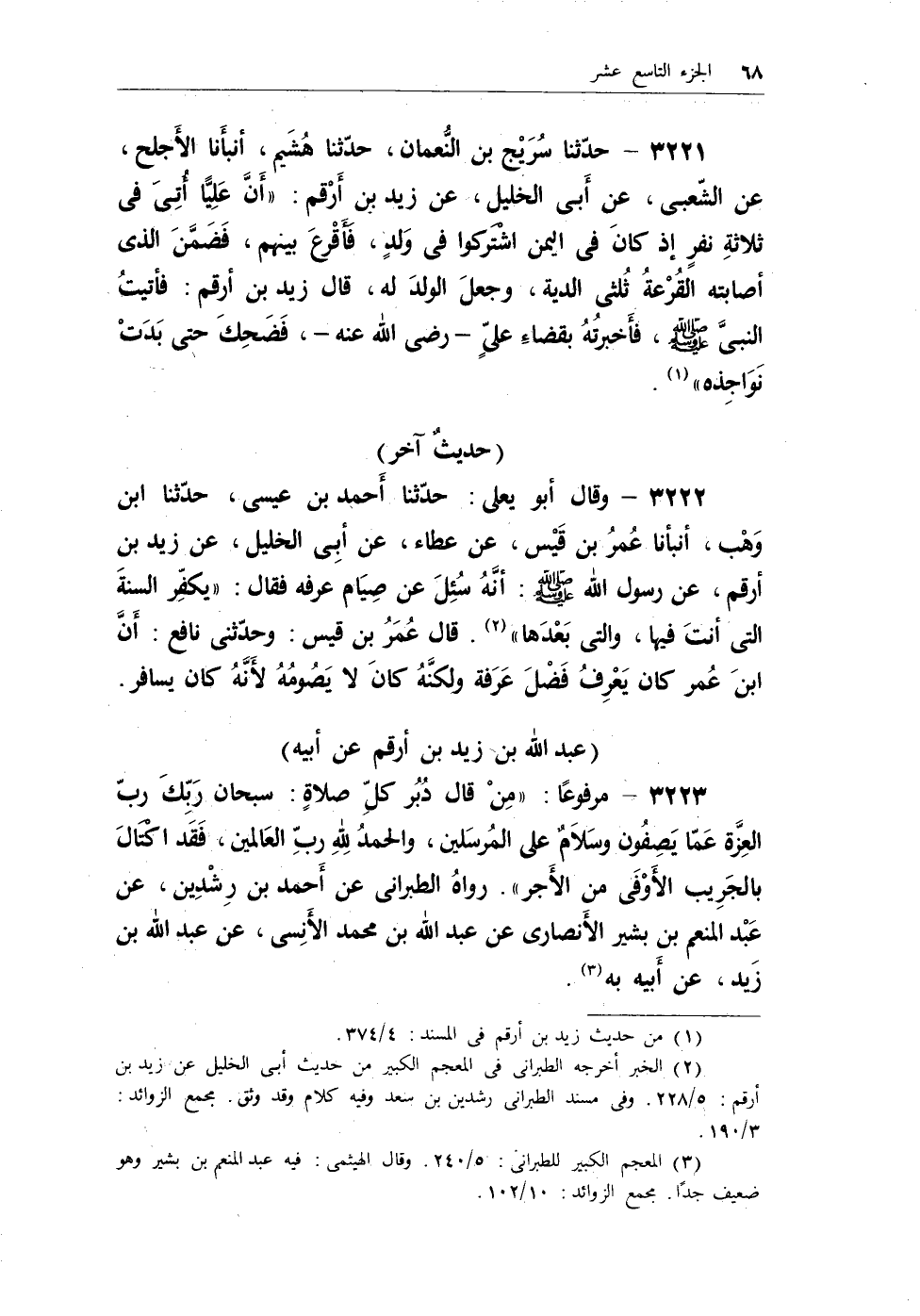 (¬2) الخبر أخرجه الطبرانى فى المعجم الكبير من حديث أبى الخليل عن زيد بن أرقم: 5/228. وفى مسند الطبرانى رشدين بن سعد وفيه كلام وقد وثق. مجمع الزوائد: 3/190.