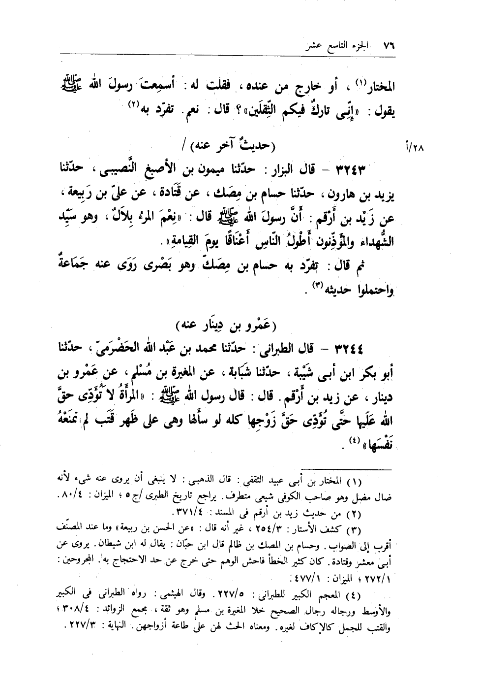 (¬1) المختار بن أبى عبيد الثقفى: قال الذهبى: لا ينبغى أن يروى عنه شىء لأنه ضال مضل وهو صاحب الكوفى شيعى متطرف. يراجع تاريخ الطبرى/ ج5؛ الميزان: 4/80.