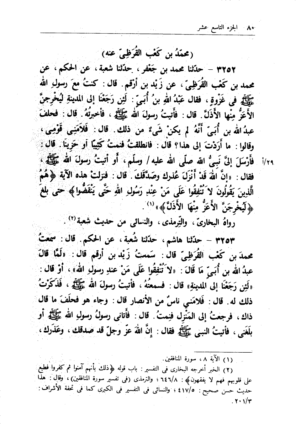 3253- حدثنا هاشم، حدثنا شعبة، عن الحكم. قال: سمعت محمد بن كعب القرظى قال: سمعت زيد بن أرقم قال: «لما قال عبد الله بن أُبَىّ ما قال: «لا تنفقوا على من عند رسول الله» ، أو قال: «لئن رجعنا إلى المدينة» قال: فسمعته، فأتيت رسول الله - صلى الله عليه وسلم -، فذكرت ذلك له. قال: فلامنى ناس من الأنصار قال: وجاء هو فحلف ما قال ذاك، فرجعت إلى المنزل فنمت. قال: فأتانى رسولُ رسولِ الله - صلى الله عليه وسلم - أو بلغنى، فأتيت النبى - صلى الله عليه وسلم - فقال: إن الله عز وجل قد صدقك، وعذرك،
