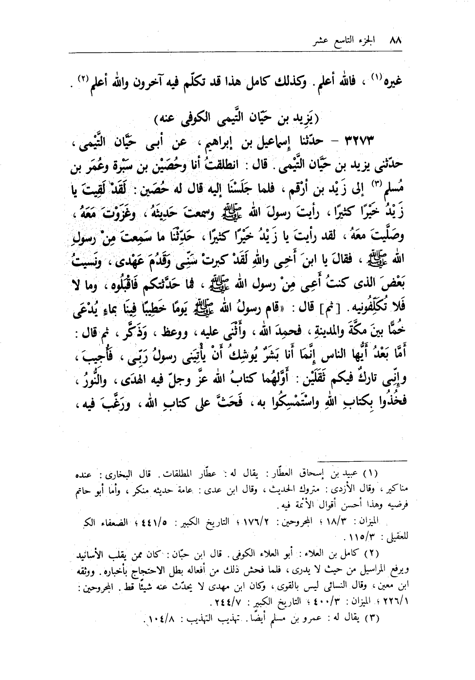 3273- حدثنا إسماعيل بن إبراهيم، عن أبى حيان التيمى، حدثنى يزيد بن حيان التيمى. قال: انطلقت أنا وحصين بن سبرة وعمر بن مسلم (¬1) إلى زيد بن أرقم، فلما جلسنا إليه قال له حصين: لقد لقيت يا زيد خيراً كثيراً، رأيت رسول الله - صلى الله عليه وسلم - وسمعت حديثه، وغزوت معه، وصليت معه، لقد رأيت يا زيد خيراً كثيراً، حدثنا ما سمعت من رسول الله - صلى الله عليه وسلم -، فقال يا ابن أخى والله لقد كبرت سنى وقدم عهدى، ونسيت بعض الذى كنت أعى من رسول الله - صلى الله عليه وسلم -، فما حدثتكم فاقبلوه، وما لا فلا تكلفونيه. [ثم] قال: «قام رسول الله - صلى الله عليه وسلم - يَوماً خَطِيباً فِينَا بماءٍ يُدْعَى خُمًّا بينَ مكَّةَ والمدينةِ، فحمِدَ الله، وأَثْنَى عليه، ووعظ، وَذَكَّر، ثم قال: أَمَّا بَعْدُ أَيُّها الناس إِنَّمَا أَنا بَشرٌ يُوشِكُ أَنْ يأْتِيَنى رسولُ رَبّى، فَأُجِيبَ، وإِنِّى تاركٌ فيكم ثَقَلَيْن: أَوَّلهُما كتابُ الله عَّز وجلّ فيه الهدّى، والنُّورُ، فخُذُوا بِكتابِ اللهِ واسْتَمْسِكُوا به، فَحَثَّ على كتابِ الله، ورَغَّبَ فيه،