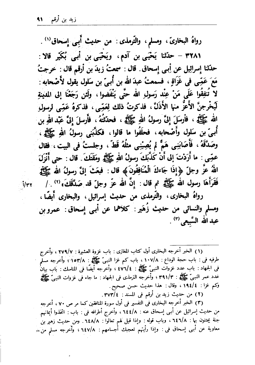 (¬2) الخبر أخرجه البخارى فى التفسير فى أول سورة المنافقين كما مر ص70، أخرجه من حديث إسرائيل عن أبى إسحاق عنه: 8/644، وأخرج أطرافه فى باب: اتخذوا أيمانهم جنة يجتنون بها: 8/646، وباب قوله: وإذا قيل لهم تعالوا: 8/648. ومن حديث زهير بن معاوية عن أبى إسحاق فى: وإذا رأيتهم تعجبك أجسامهم: 8/647؛ وأخرجه مسلم من حديث زهير بن معاوية، عن أبى إسحاق فى كتاب صفة المنافقين وأحكامهم: 5/645؛ وأخرجه الترمذى عن إسرائيل، عن أبى إسحاق فى التفسير (من سورة المنافقين) : 5/415، وقال: هذا حديث حسن صحيح؛ وأخرجه النسائى من طريق زهير فى التفسير فى الكبرى كما فى تحفة الأشراف: 3/199.