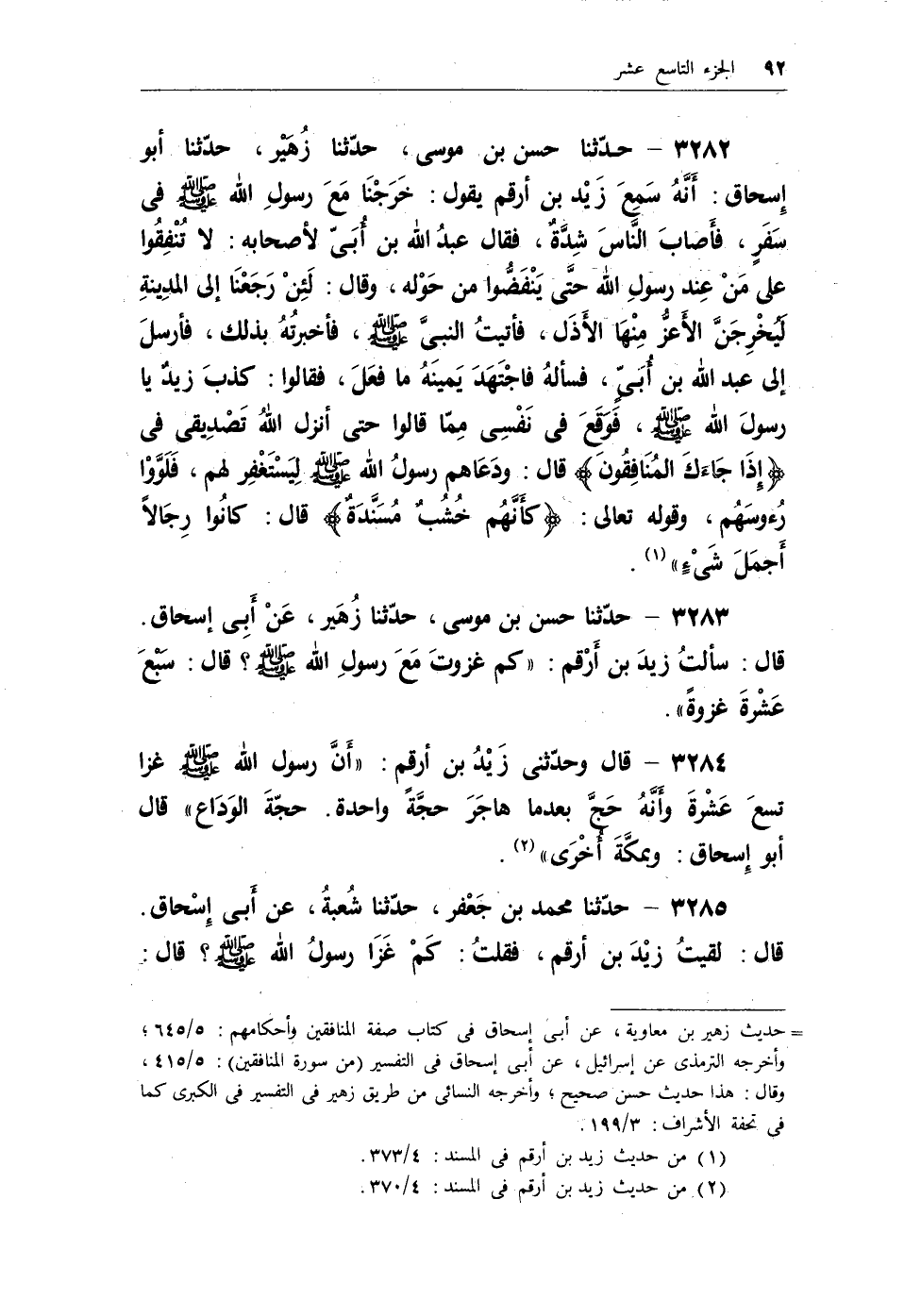 3283- حدثنا حسن بن موسى، حدثنا زهير، عن أبى إسحاق. قال: سألت زيد بن أرقم: «كم غزوت مع رسول الله - صلى الله عليه وسلم -؟ قال: سبع عشرة غزوة» .