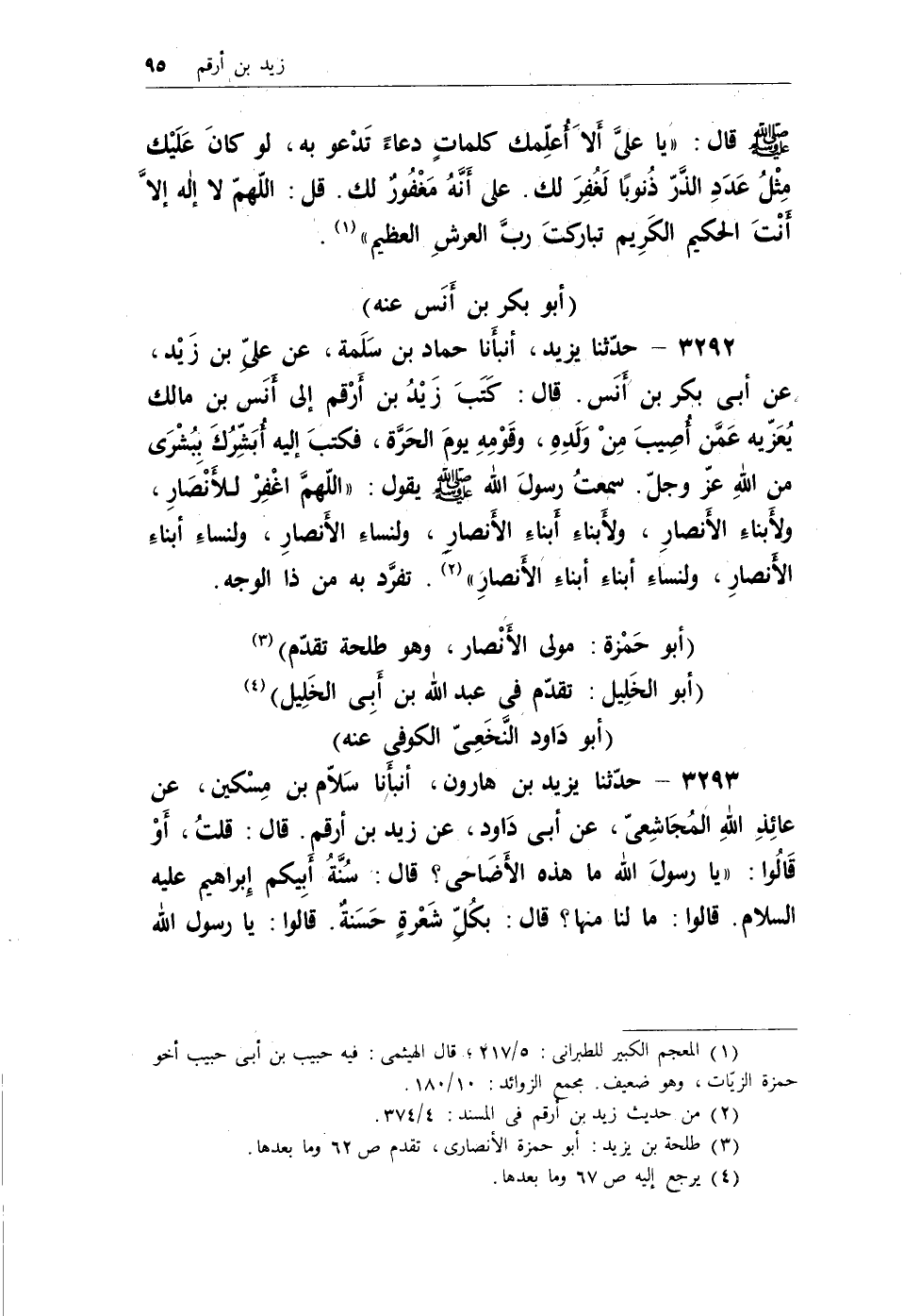 3292- حدثنا يزيد، أنبأَنا حماد بن سَلَمة، عن على بن زيد، عن أبى بكر ابن أنس. قال: كتب زيد بن أرقم إلى أنس بن مالك يعزيه عمن أصيب من ولده، وقومه يوم الحرة، فكتب إليه أبشرك ببشرى من الله عز وجل. سمعت رسول الله - صلى الله عليه وسلم - يقول: «اللهمَّ اغْفِرً للأَنْصَارِ، ولأَبناءِ الأَنصارِ، ولأَبناء أبناءِ الأنَصارِ، ولنساءِ الأَنصارِ، ولنساءِ أبناءِ الأَنصارِ، ولنساءِ أبناءِ أبناءِ الأَنصارِ» (¬1) . تفرد به من ذا الوجه.