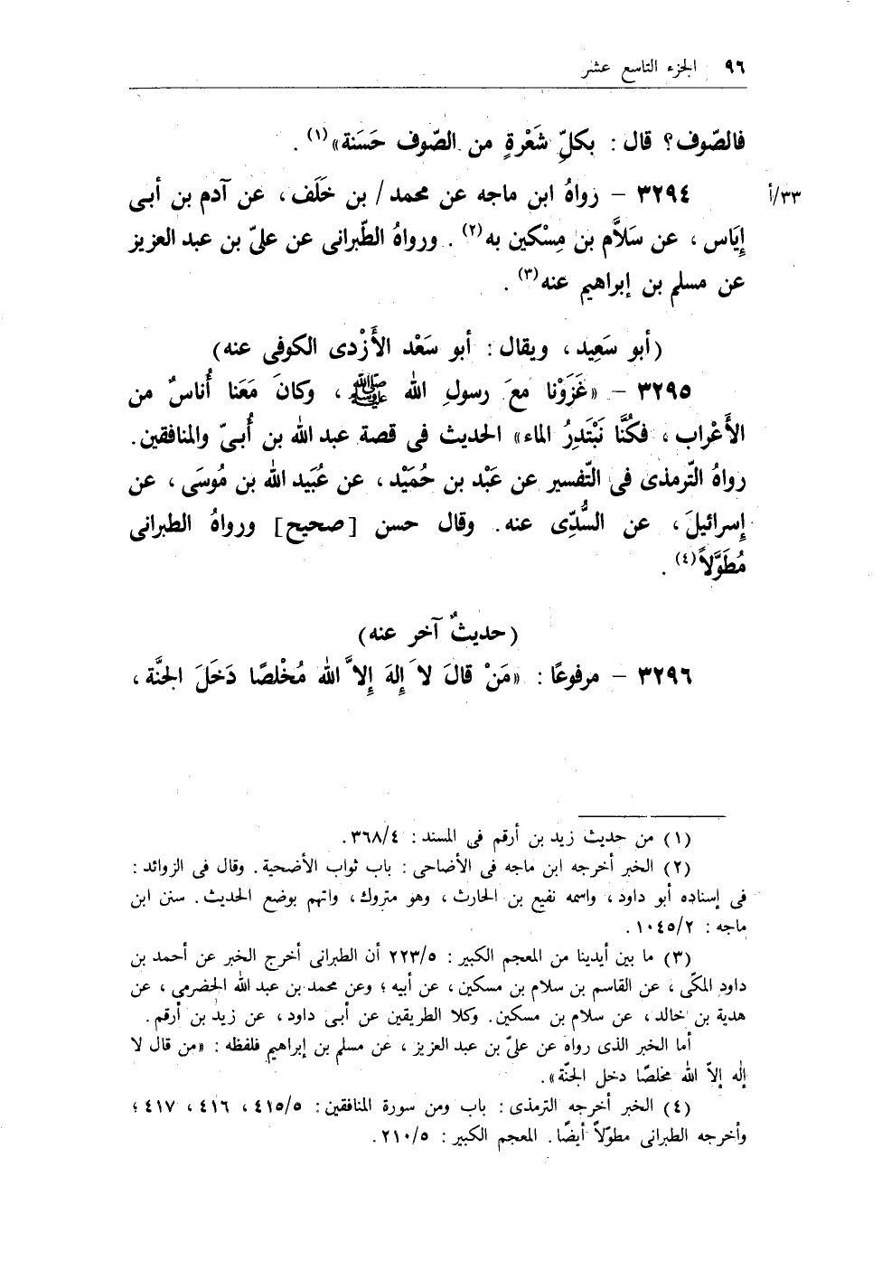 3295- «غزونا مع رسول الله - صلى الله عليه وسلم -، وكان معنا أناس من الأعراب، فكنا نبتدر الماء» الحديث فى قصة عبد الله بن أبى والمنافقين. رواه الترمذى فى التفسير عن عبد بن حميد، عن عبيد الله بن موسى، عن إسرائيل، عن السدى عنه. وقال حسن [صحيح] ورواه الطبرانى مطولا (¬3) .