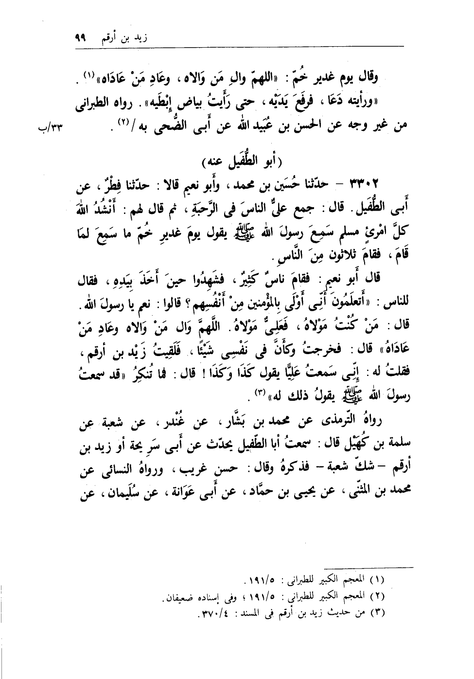 قال أبو نعيم: فقام ناس كثير، فشهدوا حين أخذ بيده، فقال للناس: «أتعلمون أنى أولى بالمؤمنين من أنفسهم؟ قالوا: نعم يا رسول الله. قال: من كنت مولاه، فعلى مولاه. اللهم وال من والاه وعاد من عاداه» قال: فخرجت وكأن فى نفسى شيئاً، فلقيت زيد بن أرقم، فقلت له: إنى سمعت عليا يقول كذا وكذا! قال: فما تنكر «قد سمعت رسول الله - صلى الله عليه وسلم - يقول ذلك له» (¬1) .