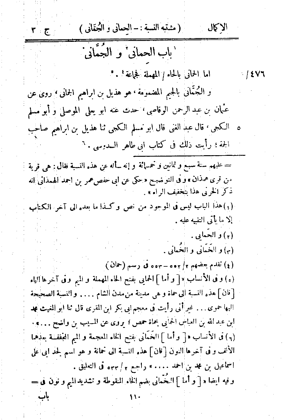 وفيه أيضا ""وأما" الخماني بضم الخاء المنقوطة وتشديد الميم ونون في آخرها قبلا ألف ظني أن هذا النسبة إلى قرية منها أبو إسحاق إبراهيم بن عبد الله الخماني الفقيه، هكذا ذكره عبد الغني بن سعيد".