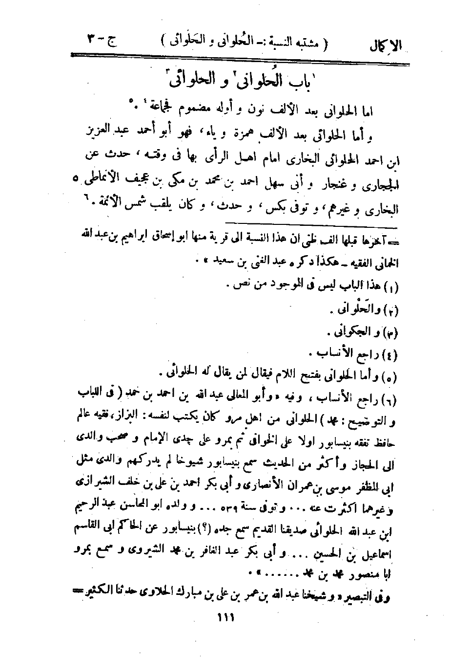 وفي التبصير "وشيخنا عبد الله بن عمر بن علي بن مبارك الحلاوي حدثنا الكثير عن أصحاب النجيب، وكان جده مبارك مباركا صالحا يزار ويعتقد". وفي الأنساب ""وأما" الجكواني بضم الجيم و"سكون" الكاف والواو المفتوحة "فإن" هذه النسبة إلى جكوان وهي قرية بسجستان منها أبو محمد الحسن بن تاجر "في اللباب: فاخر" الكرابيسي سمع "أبا" سعيد محمد بن الحسن القاضي السجزي، روى لنا عنه حنبل بن علي بن الحسين السجزي بهراة سمع منه بسجستان بإفادة والده أبي الحسن".
