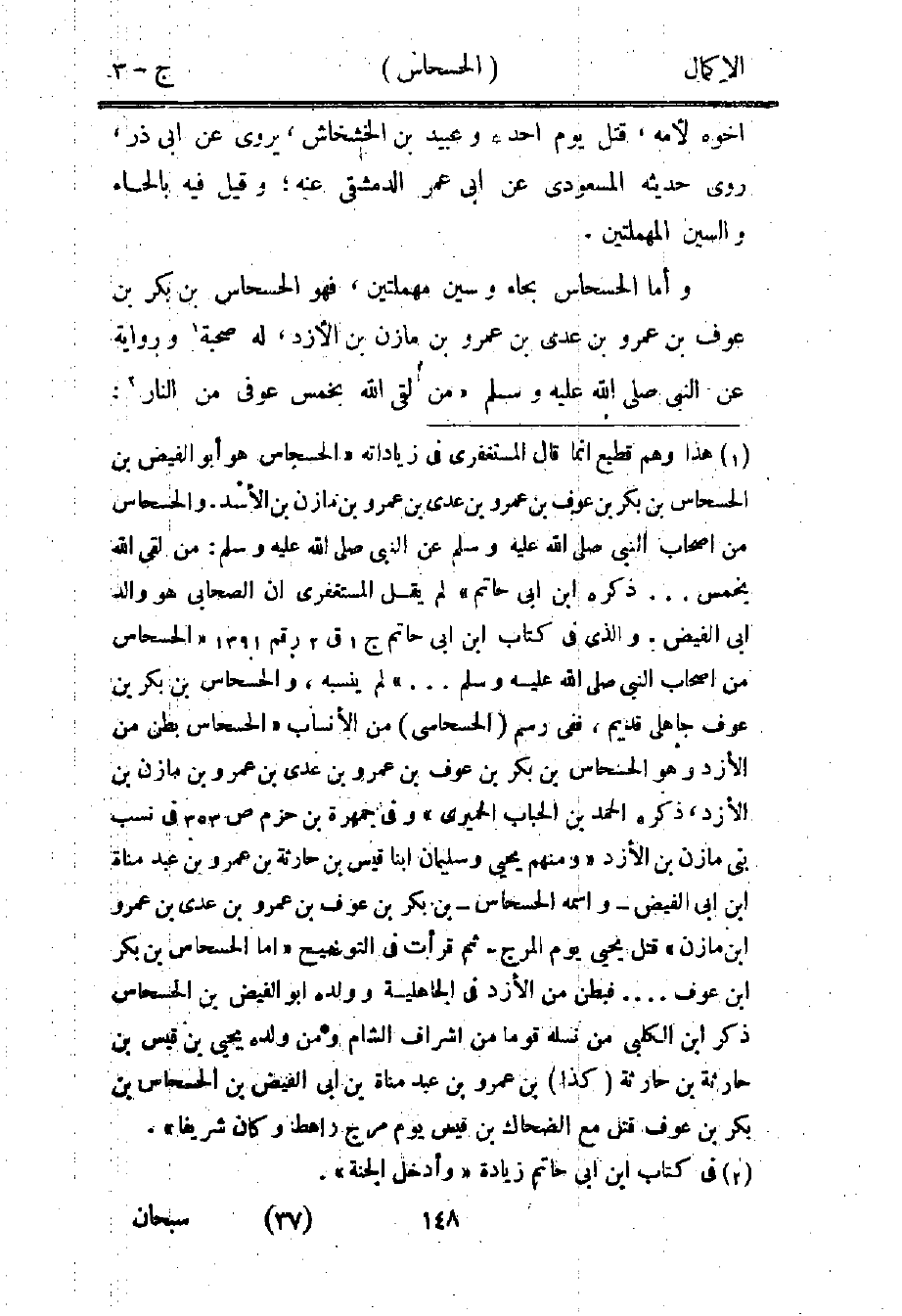 وأما الحسحاس بحاء وسين مهملتين، فهو الحسحاس بن بكر بن عوف بن عمرو بن عدي بن عمرو بن مازن بن الأزد، له صحبة1 ورواية عن النبي صلى الله عليه وسلم من لقي الله بخمس عوفي من النار2: