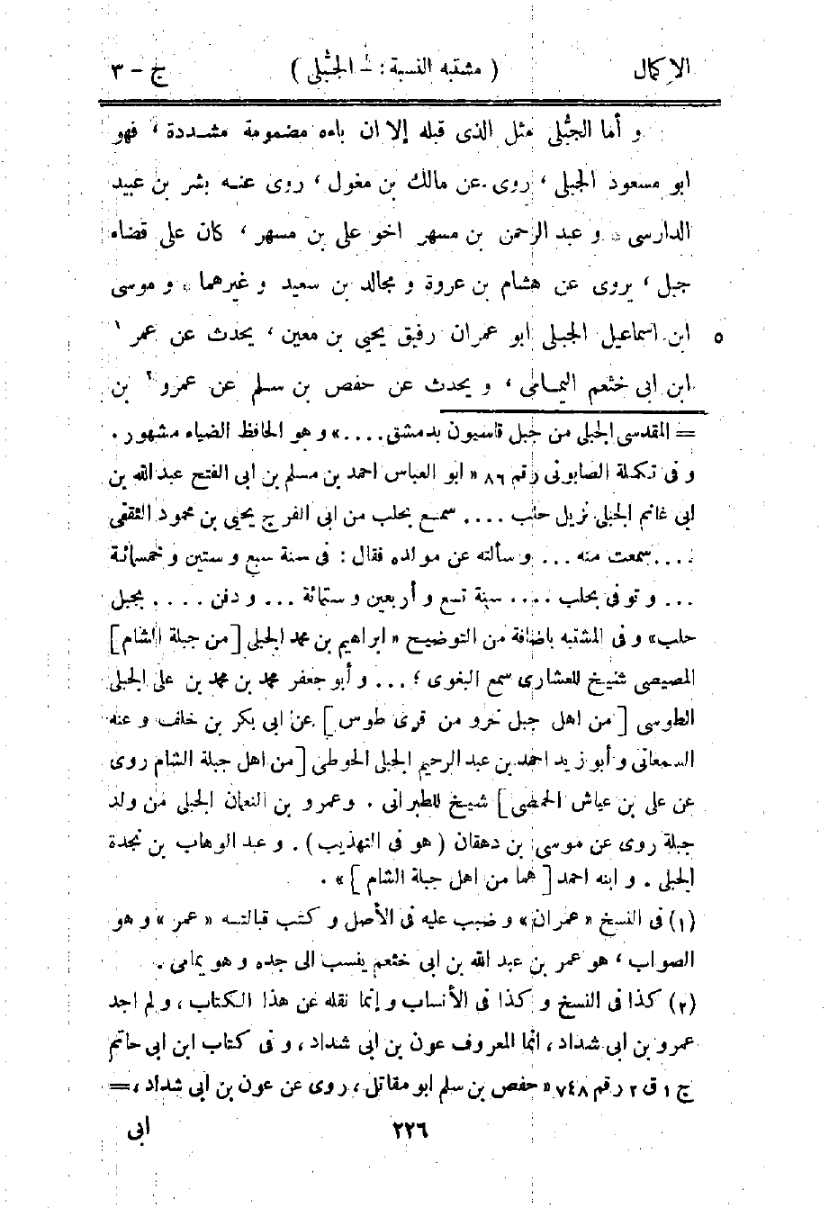 = المقدسي الجبلي من جبل قاسيون بدمشق...." وهو الحافظ الضياء مشهور. وفي تكملة الصابوني رقم 86 "أبو العباس أحمد بن مسلم بن أبي الفتح عبد الله بن أبي غانم الجبلي نزيل حلب.... سمع بحلب من أبي الفرج يحيى بن محمود الثقفي.... سمعت منه ... وسألته عن مولده فقال: في سنة سبع وستين وخمسمائة ... وتوفي بحلب.... سنة تسع وأربعين وستمائة ... ودفن.... بجبل حلب" وفي المشتبه بإضافة من التوضيح "إبراهيم بن محمد الجبلي "من جبلة الشام" المصيصي شيخ للعشاري سمع البغوي؛ ... وأبو جعفر محمد بن محمد بن علي الجبلي الطوسي "من أهل جبل خرو من قرى طوس" عن أبي بكر بن خلف وعنه السمعاني وأبو زيد أحمد بن عبد الرحيم الجبلي الحوطي "من أهل جبلة الشام روى عن علي بن عياش الحمصي" شيخ للطبراني. وعمرو بن النعمان الجبلي من ولد جبلة روى عن موسى بن دهقان "هو في التهذيب". وعبد الوهاب بن نجدة الجبلي. وابنه أحمد "هما من أهل جبلة الشام".