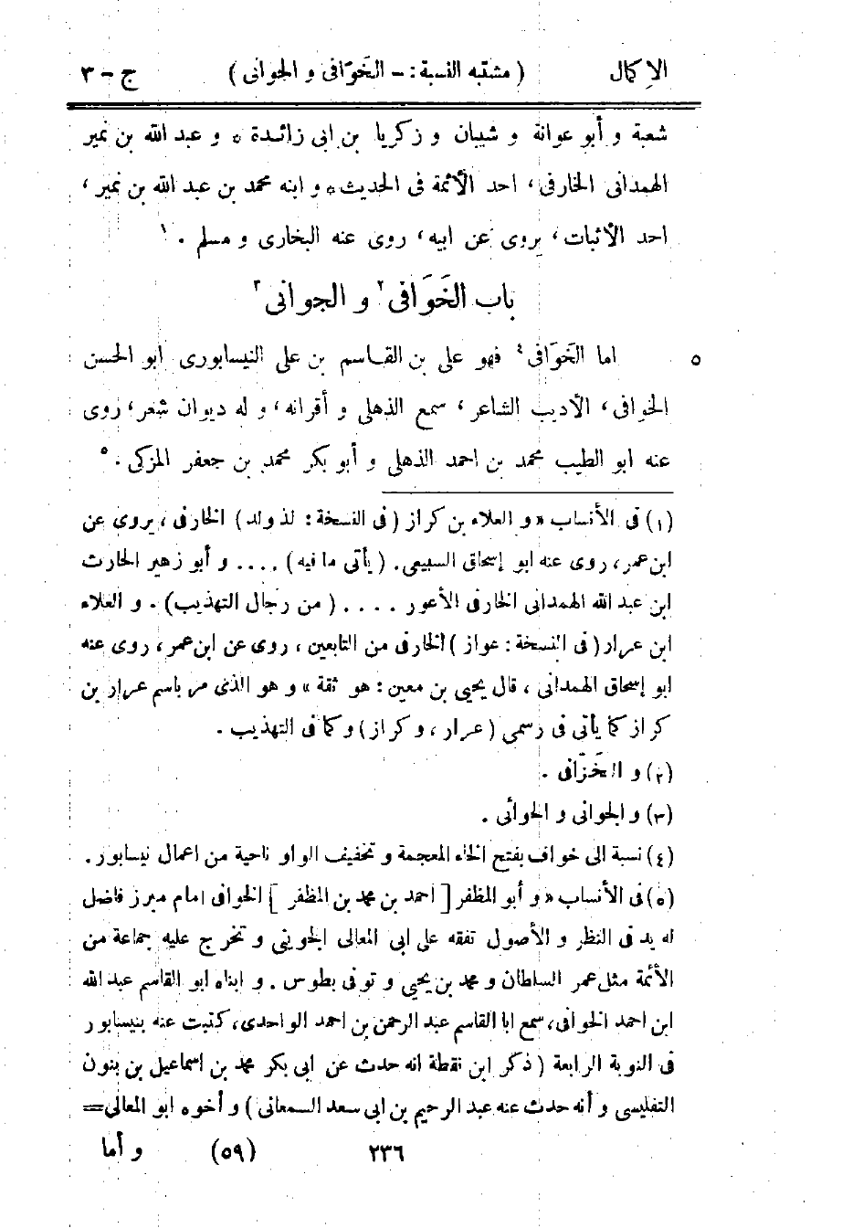 4 في الأنساب "وأبو المظفر "أحمد بن محمد بن المظفر" الخوافي إمام مبرز فاضل له يد في النظر والأصول تفقه على أبي المعالي الجويني وتخرج عليه جماعة من الأئمة مثل عمر السلطان ومحمد بن يحيى وتوفي بطوس. وابناه أبو القاسم عبد الله بن أحمد الخوافي، سمع أبا القاسم عبد الرحمن بن أحمد الواحدي، كتبت عنه بنيسابور في النوبة الرابعة" ذكر ابن نقطة أنه حدث عن أبي بكر محمد بن إسماعيل بن بنون التفليسي وأنه حدث عنه عبد الرحيم بن أبي سعد السمعاني" وأخوه أبو المعالي =