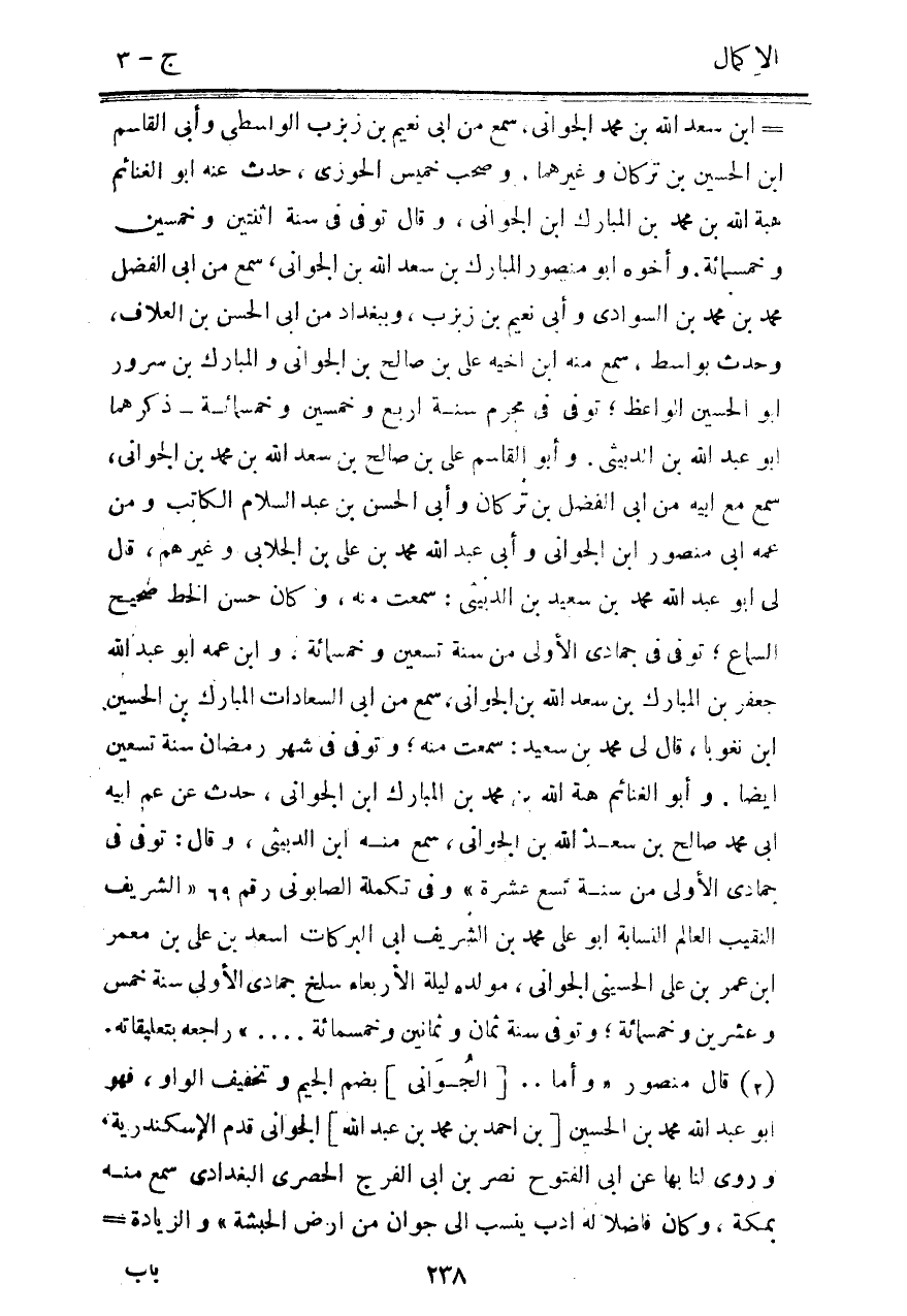 2 قال منصور "وأما.. "الجواني" بضم الجيم وتخفيف الواو، فهو أبو عبد الله محمد بن الحسين "بن أحمد بن محمد بن عبد الله" الجواني قدم الإسكندرية. وروى لنا بها عن أبي الفتوح نصر بن أبي الفرج الحصري البغدادي سمع منه بمكة، وكان فاضلا له أدب ينسب إلى جوان من أرض الحبشة" والزيادة =