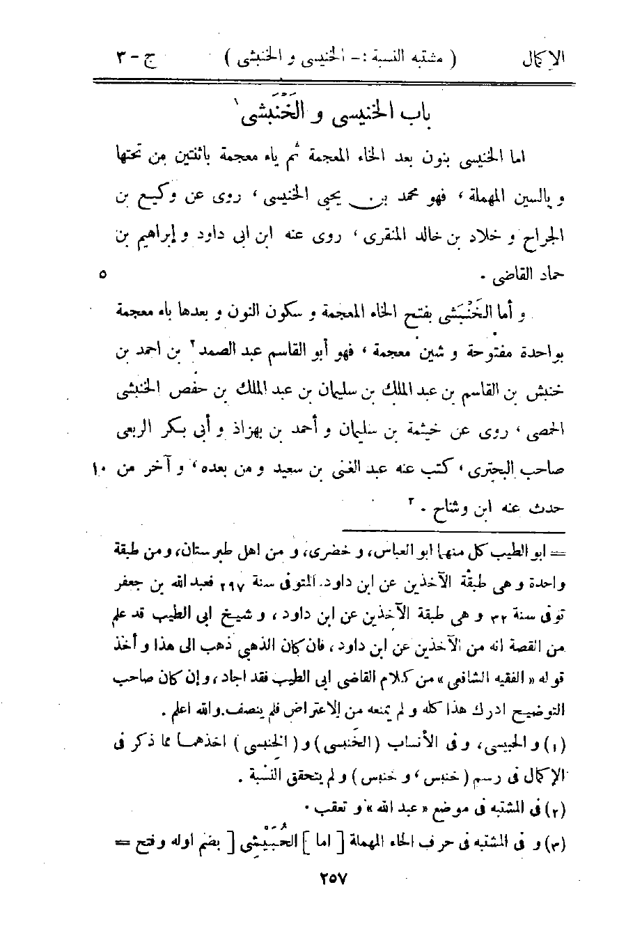 1 والحبيسي، وفي الأنساب "الخَنبسي" و"الخِنبسي" أخذهما مما ذكر في الإكمال في رسم "خنبس، وخنبس" ولم يتحقق النسبة.