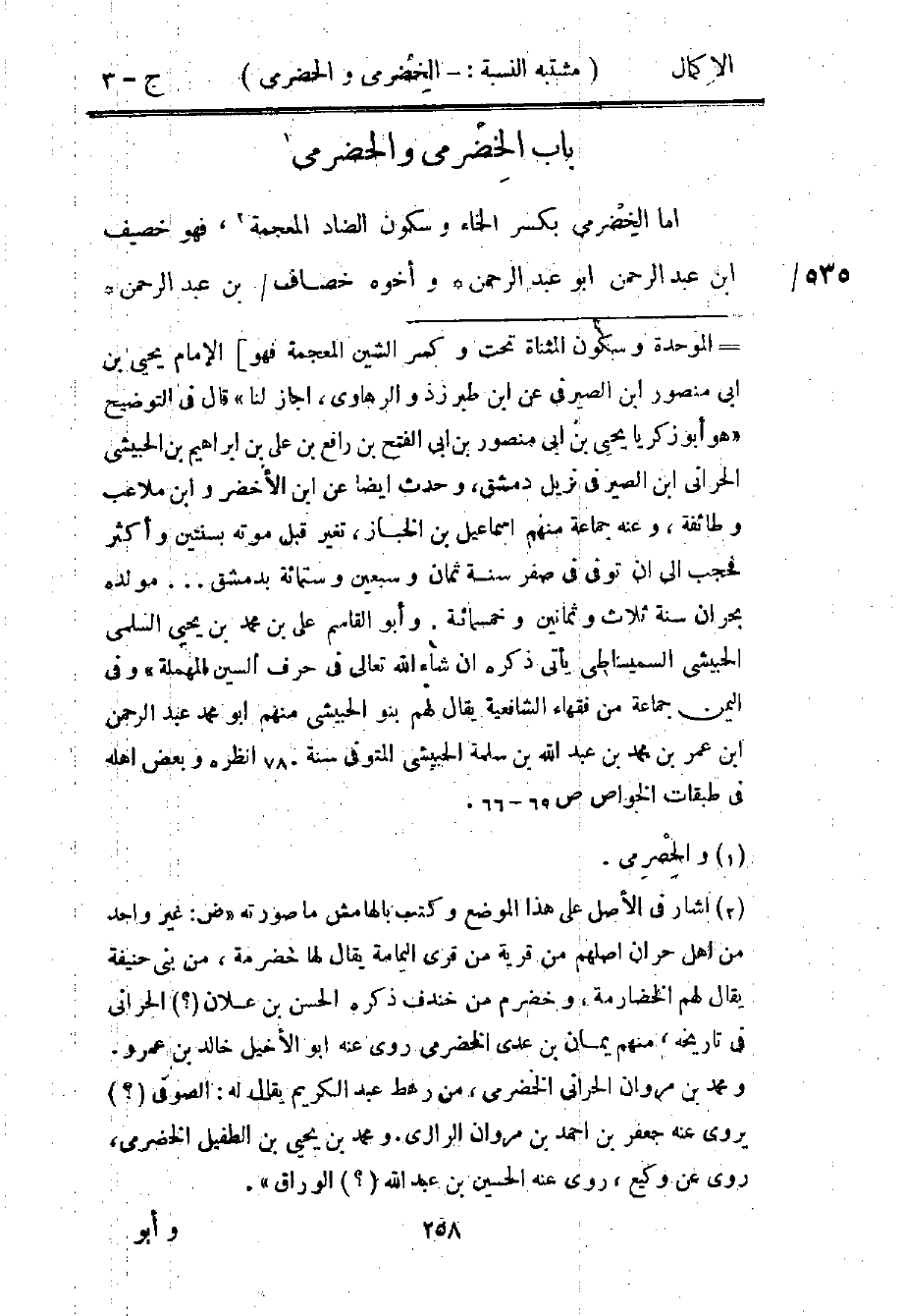 2 أشار في الأصل على هذا الموضع وكتب بالهامش ما صورته "ض: غير واحد من أهل حران أصلهم من قرية من قرى اليمامة يقال لها خضرمة، من بني حنيفة يقال لهم الخضارمة. وخضرم من خندف ذكره الحسن بن علان "؟ " الحراني في تاريخه، منهم يمان بن عدي الخضرمي روى عنه أبو الأخيل خالد بن عمرو. ومحمد بن مروان الحراني الخضرمي، من رهط عبد الكريم يقال له: الصوفي "؟ " يروي عنه جعفر بن أحمد بن مروان الرازي. ومحمد بن يحيى بن الطفيل الخضرمي،